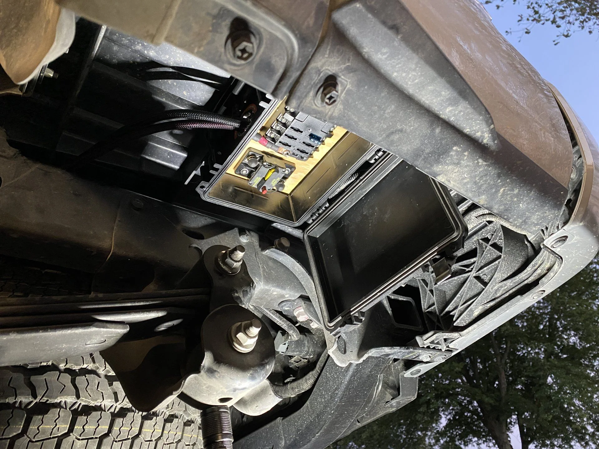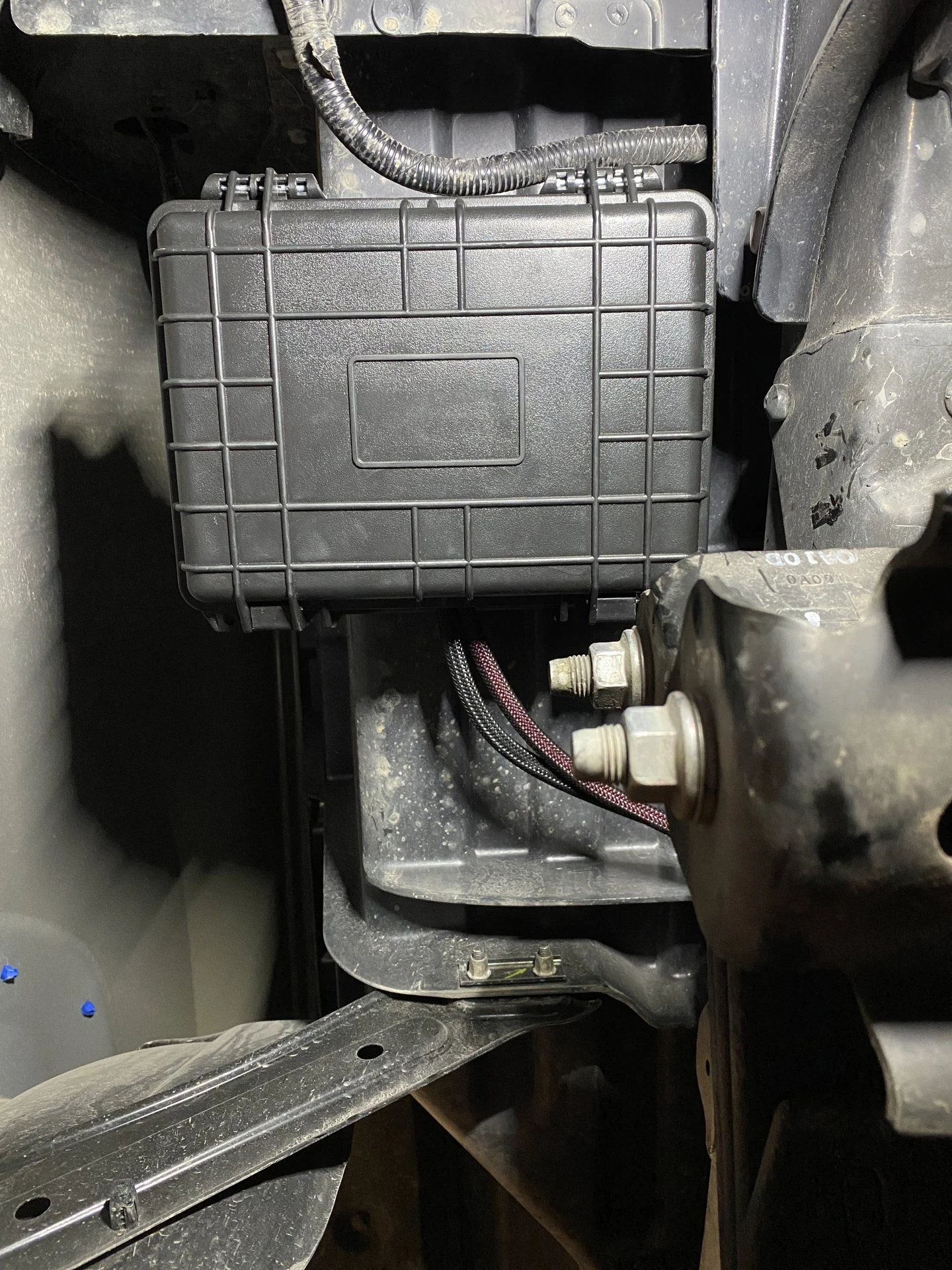 I’d been trying to come up with an idea of where to put a fuse panel in the rear of the truck for power to the fridge and air compressor. I’m going to try this and hope I don’t burn the truck to the ground. I carefully ran 4 gauge from the house battery along the driver side frame rail following the factory loom to the bottom of the bed. I mounted a Harbor Freight “weatherproof” case under the bed in the rear for the fuse panel and circuit breaker.