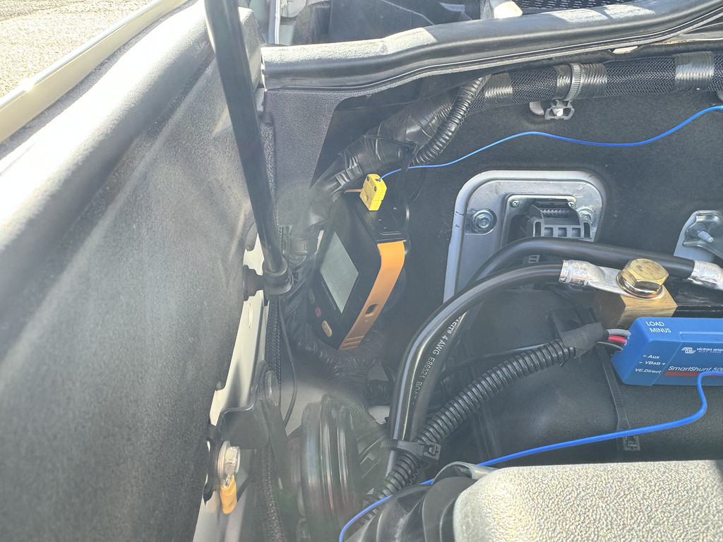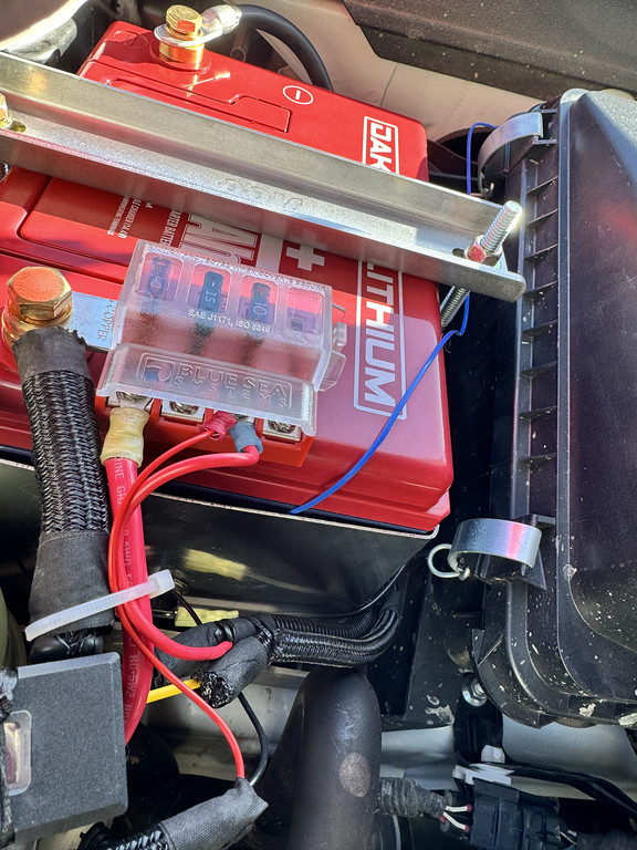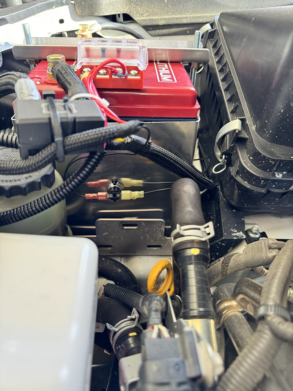 There was some discussion in the the 'what have you done this week' thread regarding the temperature impact to Li batteries mounted under the hood. I currently have an X2Power AGM in the Slee bracket. I mounted a little data logger to the engine side battery terminal just to see what was going on. To be fair, this is a measurement of ambient temp at that location and not the actual battery temp, though one would assume that side of the battery would eventually equalize with ambient.