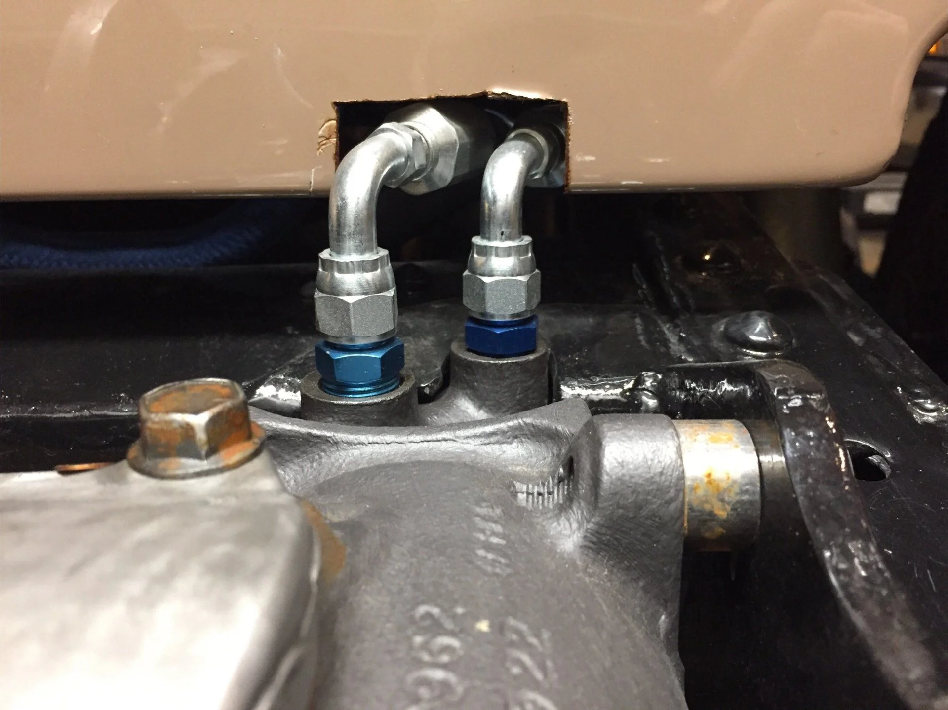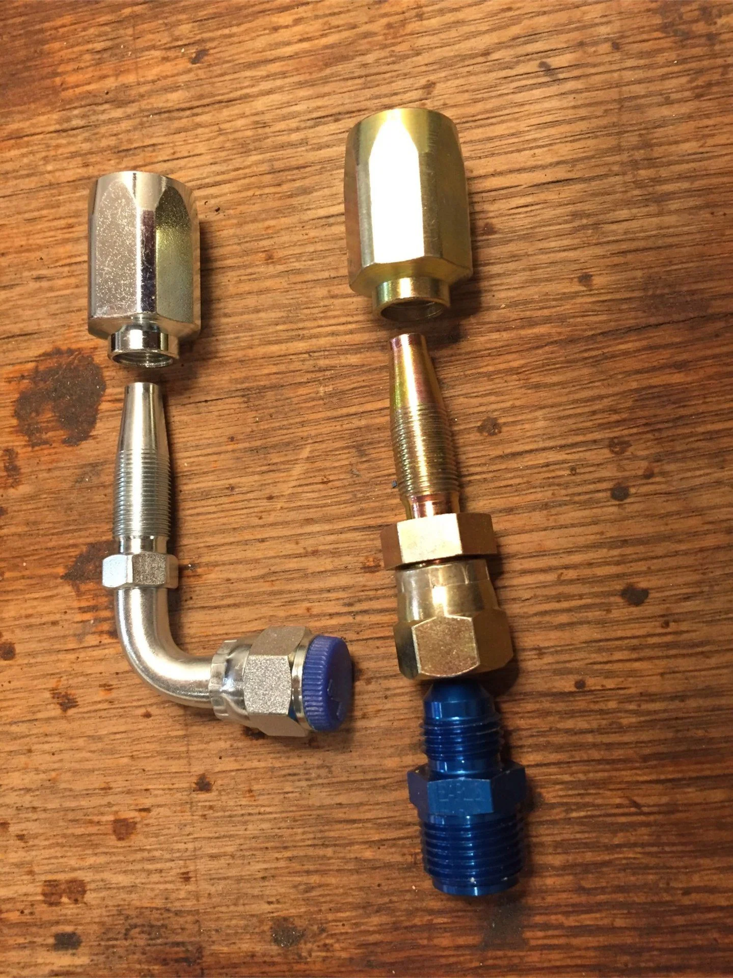 I had no clue how I was going to route lines so I ordered the -6AN blue parker hose you saw. The 90° fittings were Fragola -6AN part# 259006. You can just cut hose to length and twist the fittings on. At the sag box I used male -6AN to 5/8 & 11/16 adapters Fragola #491959 & #491956. The Downside of the adapters is they raise the fittings up so you can’t sneek the hose under the bib. I’ve seen where folks route hose around the bib. Still feel guilty for sawzalling my bib