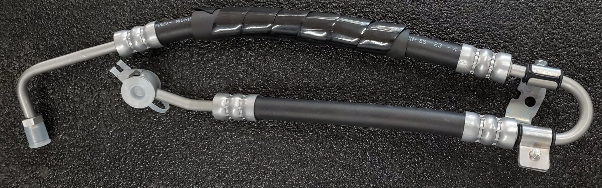 New transmission cooler lines made up using Gates 3/8" 400 psi hose (Napa part# H-1937). Covered with braided sleeving and spiral sleeve to be added where needed.