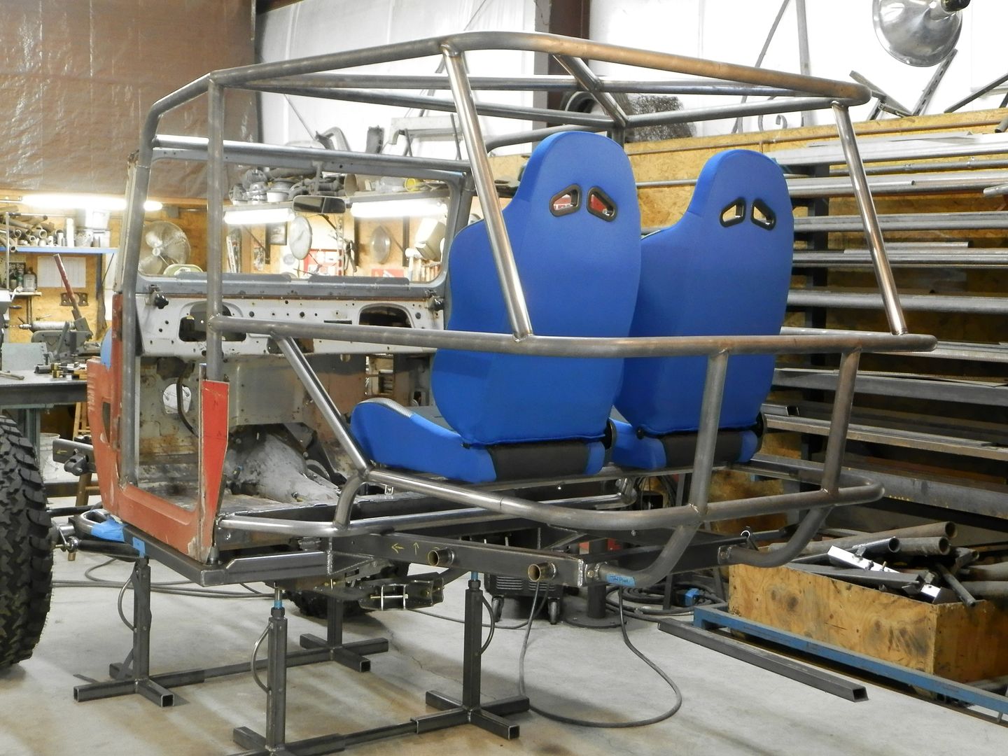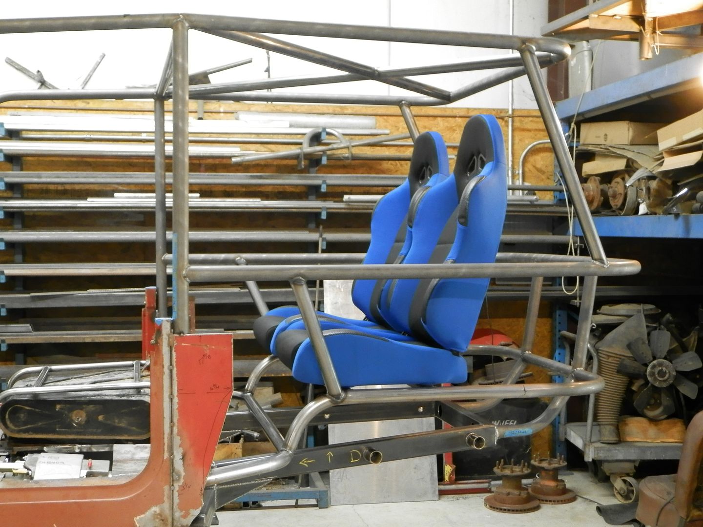 If it were me I would angle the top rear half of the upper hoop downward to give it a slight fastback look. Also the seats to me would be more comfortable if instead of them mounted level, mount them at a angle so the rear passengers feel more like they are sitting in a supra, this will allow for a lower rear roof line and more comfortable. Why are the rear seats sitting so high up? The front end is stretched a lot, too much for my taste if your going for a 40 look, but its incomplete yet and I could be seeing it wrong. I think what makes the cage look unusual too is how far above the windshield frame it goes. Your fab work is clean, and look forward to the end product. He should put tail lights in it unless he doesn't want to drive it at all on the street(what fun is that?)