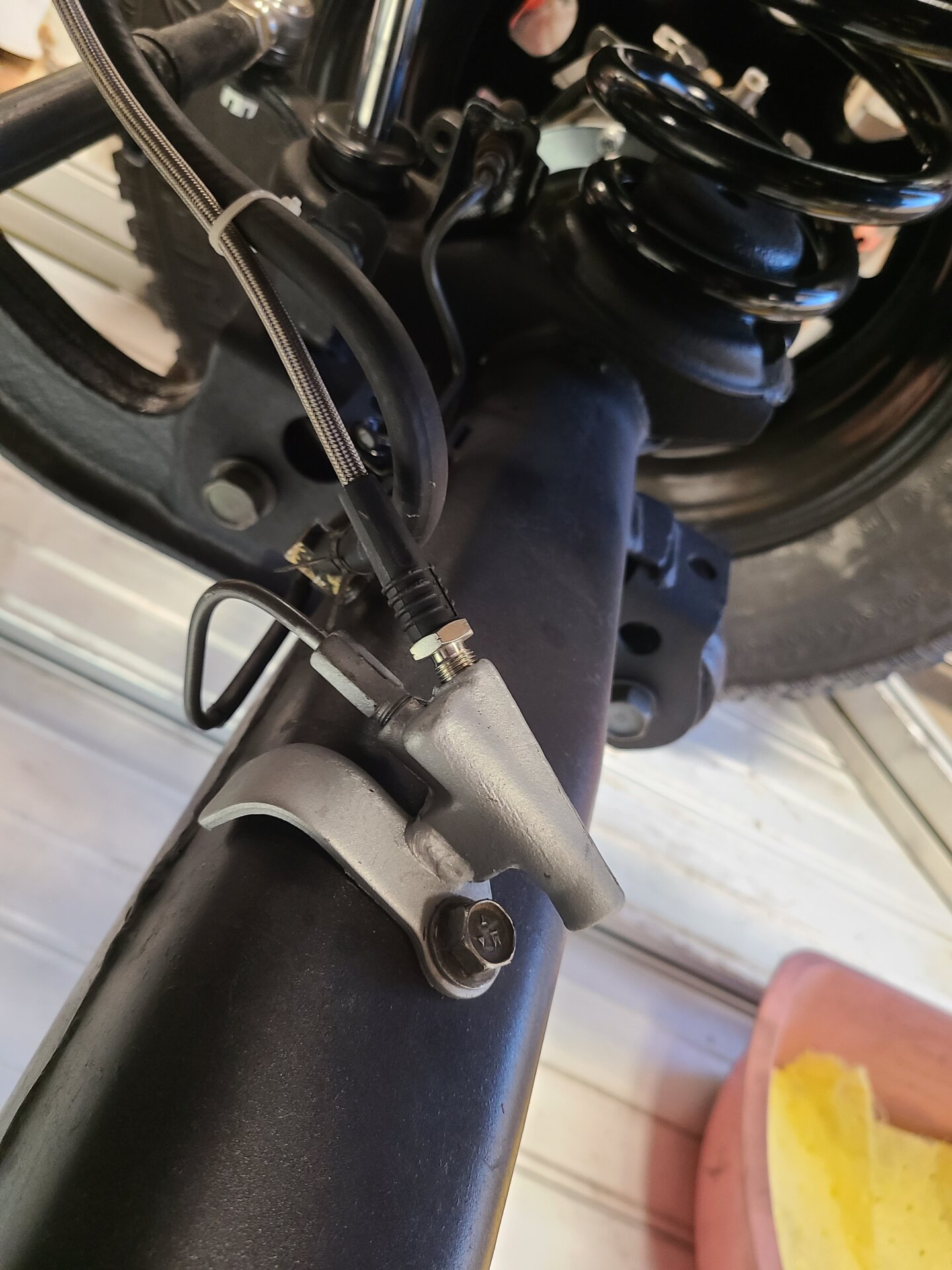 Now on the front, each wheel brake is fed by a separate flex. I'm assuming that is because of the abs system that operates on 3 channels, for lack of a better term.