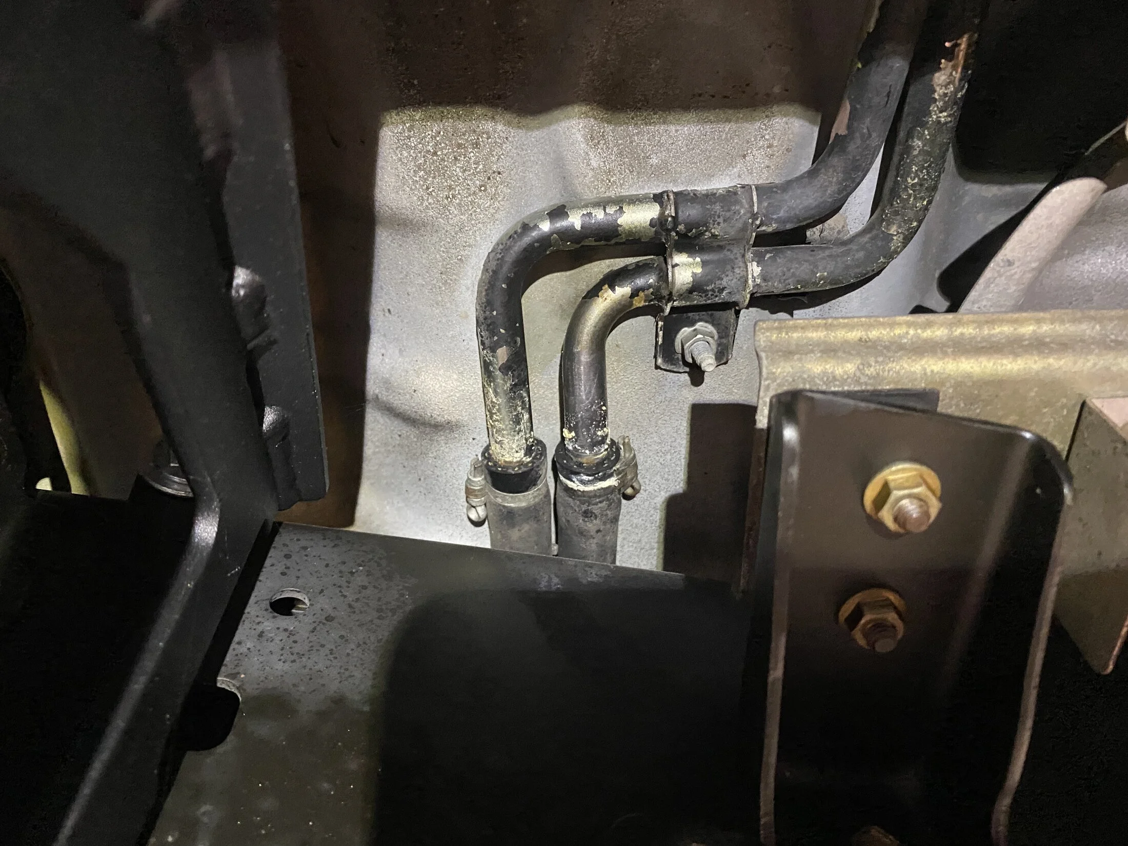 Was under my car over the weekend. Noticed these two rear-most rubber heater hoses have a small leak by the clamp. Ive read through this thread but I’m still confused if you guys are talking about these two hoses or something else. These are definitely NOT near the firewall. I took a pic from far away to show where they’re located, kinda between the T-case and exhaust if it makes sense. The metal lines are still in perfect shape aside from paint flaking off from exhaust heat I imagine. Vehicle is from Nevada.