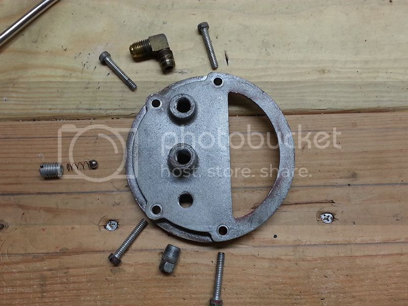 The rear cover plate after cleaning. No clue what the purpose of the drain plug is. The adjusting screw I found out controls the air going through the fuel pickup siphon, controlling the mixture. It was cranked down hard with solid buildup underneath and all gummed up with old thread sealer. The brass fitting is where the air is pumped out through the system to the fuel siphon.