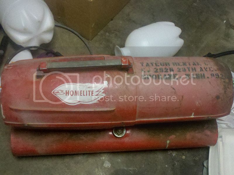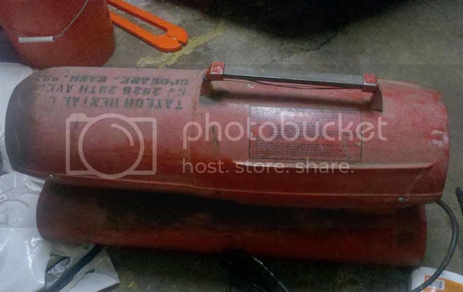 Notice the bailing wire tied to the ends of the handle. The rod just slipped into the ends but because of the heater's weight, the sheet metal shroud would flex and the rod would pop right out. Also the screws holding the upper shroud half onto the lower were mismatched sheet metal screws that barely held the halves together.
