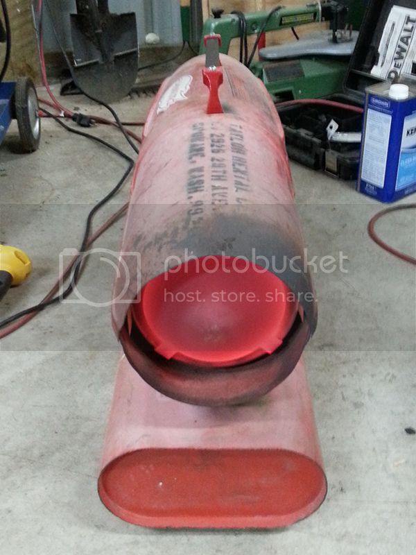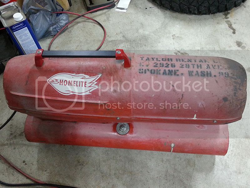 Heater reassembled after cleanup. I put a couple large fender washers under the handle ends and used a couple screws with acorn nuts to secure them to the bar. Solid as a rock now. Since they were small enough to fit in my toaster oven I painted and baked them. The shroud halves and tank will likely be done in the Summer. The weather was cooling off fast here and I didn't have time to wait for a good cure without the help of an oven.