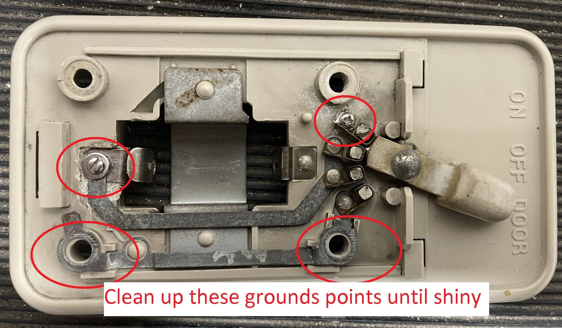 - Clean both ground points. This is where the big screws attach to the roof and provide the ground.