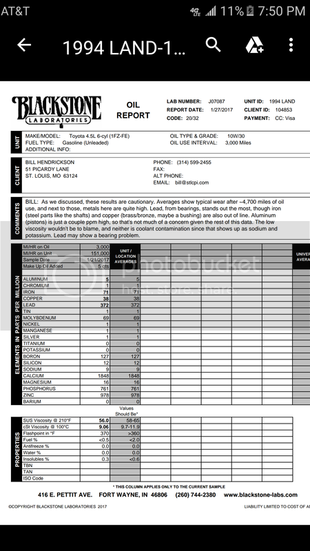 So I've had the LC for 3 months and put 3k miles on it. The PO didn't do much pm and the truck sat for years. I baselines it when I got it and since have always been worried about a blown head gasket so I sent off an oil sample last week. I got a call today from BSL saying they did not find any coolant in the oil but did see lots of lead. They say typically levels around 2ppm and I was 400ppm. He recommended not driving and I may have thrown a bearing. Car drives fine (weird hesitation accelerating) but no drops in oil pressure. My mechanic said drive it and retest in 1000 miles. Anyone have any thoughts. Thanks.