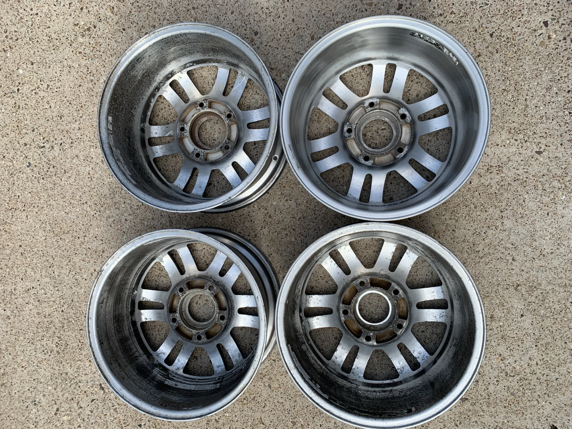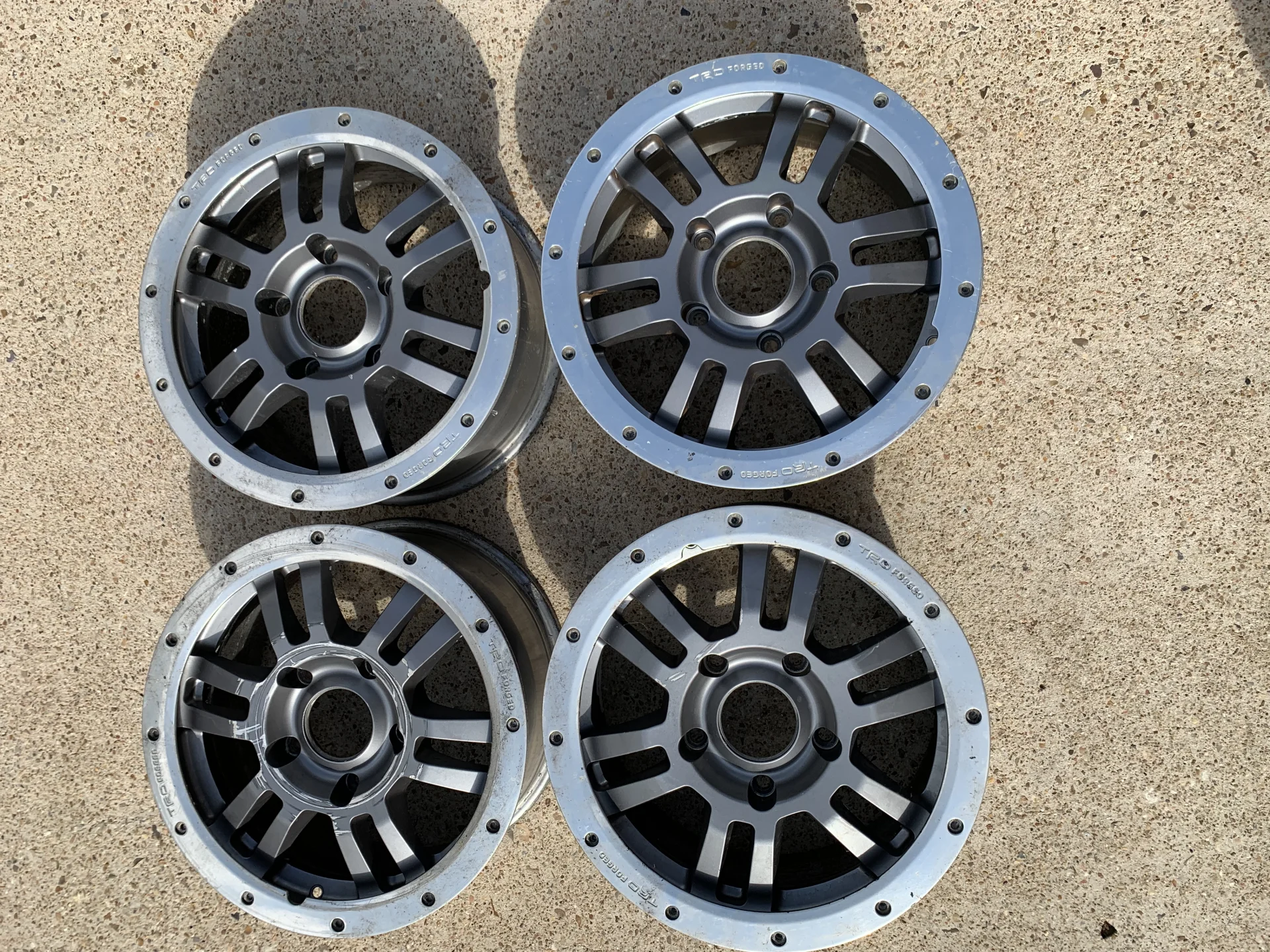 Set of four TRD Rock Warrior Five Lug Wheels for sale. I'm selling the set for $800 and you pay for shipping (my zip is 77450 for shipping). I paid more for them, but want to move them quickly so not looking to break the set up. Fortunately for the buyer I have already removed all the screws so the tough part is done. Note, one of the wheels has some scaring on the front face, but not so bad that it can't be refurbished. Wife changed her mind and no longer wants me to restore these for her Sequoia. Hoping to get my other set restored and on the LC200 soon