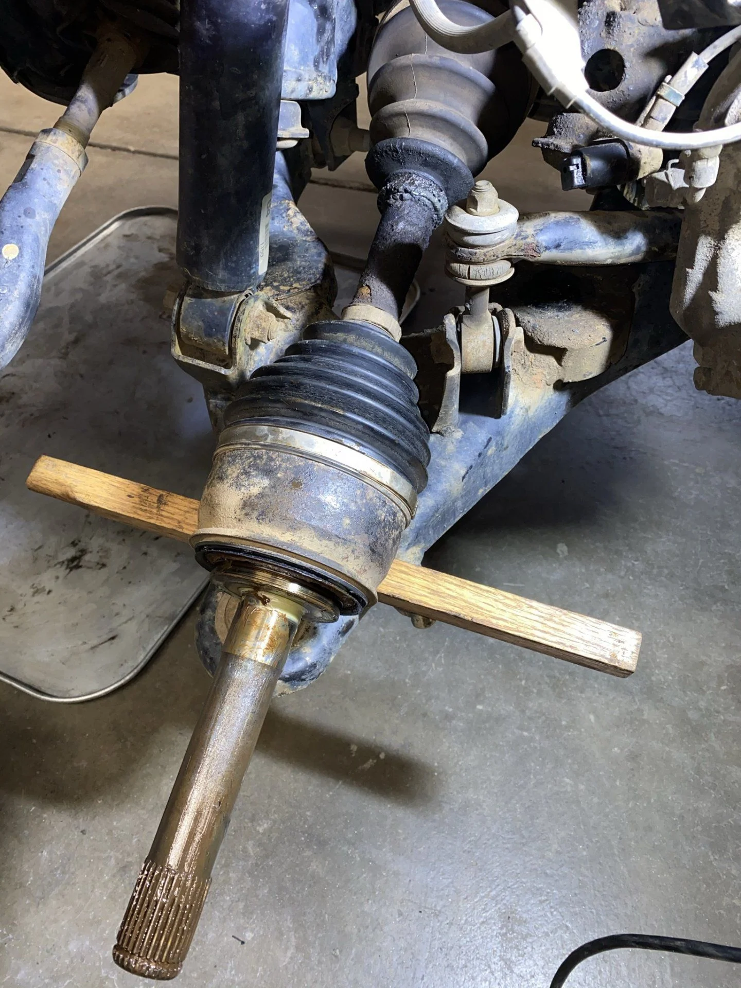 The brown grease here on axle of FDS, is sign of water entry. The hubs grease was a nice red, as was all of other side. This happens from using old loose grease cap. Can also be from warped hub flange, from pound on it or bad hub flange gasket. In later we see bad grease into bearings. Also a bad seal in rear of knuckle or hub.