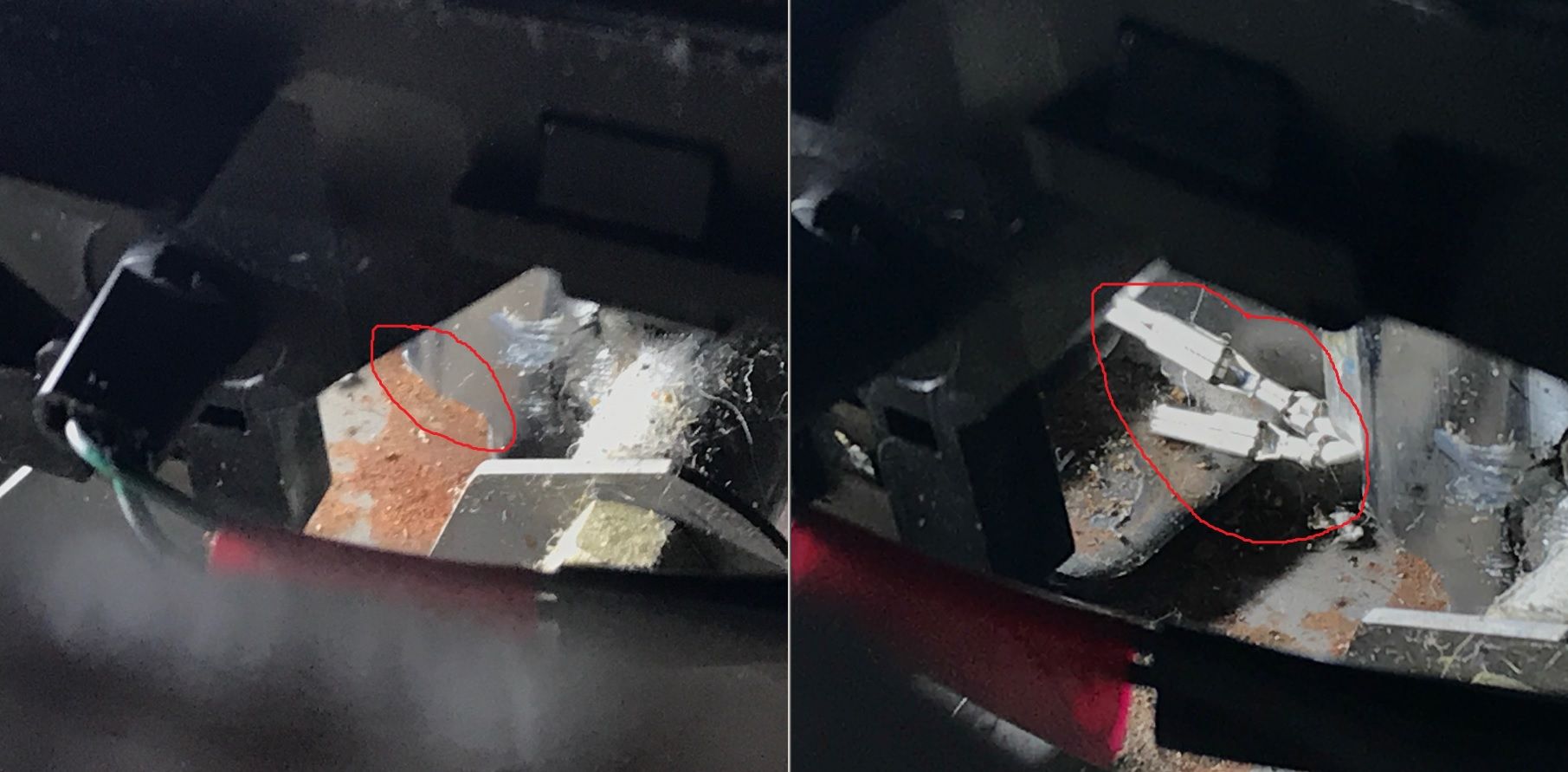 - Using the long pick, you'll need to gently move the plastic tabs that are holding in the two pins. I've circled the tabs in the left pic below, and drawn arrows showing how they should be moved. While you're moving each tab with the pick, gently pull on that wire and it will pull out. Don't pull too hard...