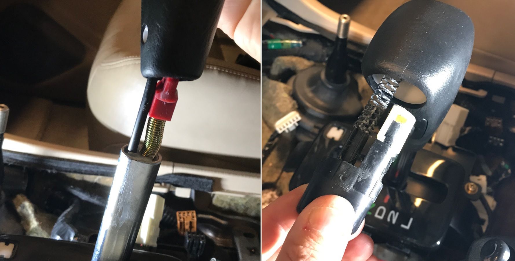 - Gently remove the knob while constantly guiding the O/D wires from below. The metal pins may get hung up when passing through the shift post, just be gentle and jiggle the wires until they come out on their own.