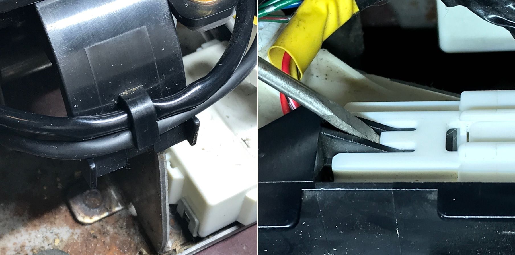 4. Release O/D harness from plastic clip on rear of shifter housing (below left), and release the connector on the passenger side by gently prying up retention tab with small flathead screwdriver (below right). Unplug the connector from its mate.