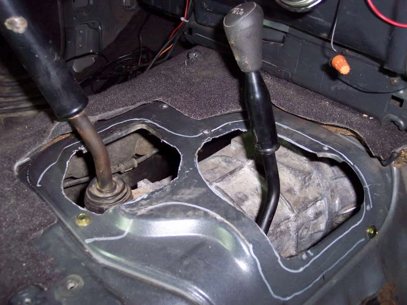 I looked at swapping out the tranny hump cover out of the 79, with the manual holes already cut into it. But the covers were slightly different, so I traced out the shifter boot plate over my auto cover, drew in the hole sizes and fired up the sawz-all. All went well, I also created another project for myself by cutting out the carpet on the drivers side (easier working), now I have to do the rest. Probably a good thing since carpet holds the stink of the last thing you just stepped in