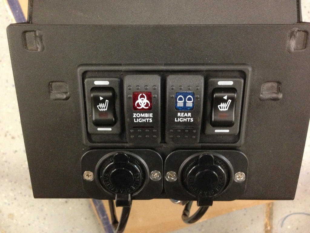 I decided to mount my aux switches and seat heaters to the front of the console as opposed to the dash. There was a lot of "measure three times, cut once" involved in this. I also added a 12v socket and a dual USB charger as well just for grins.
