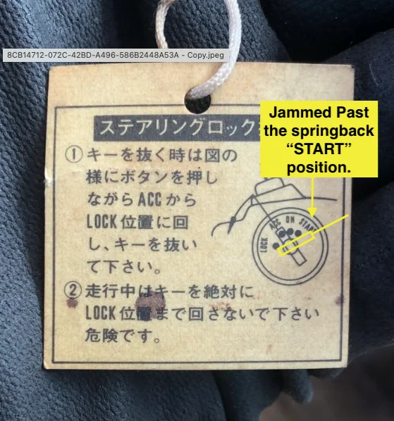 The Key has rotated past the "START" (where it would mechanically spring back to "ON" position) and now is blocked.