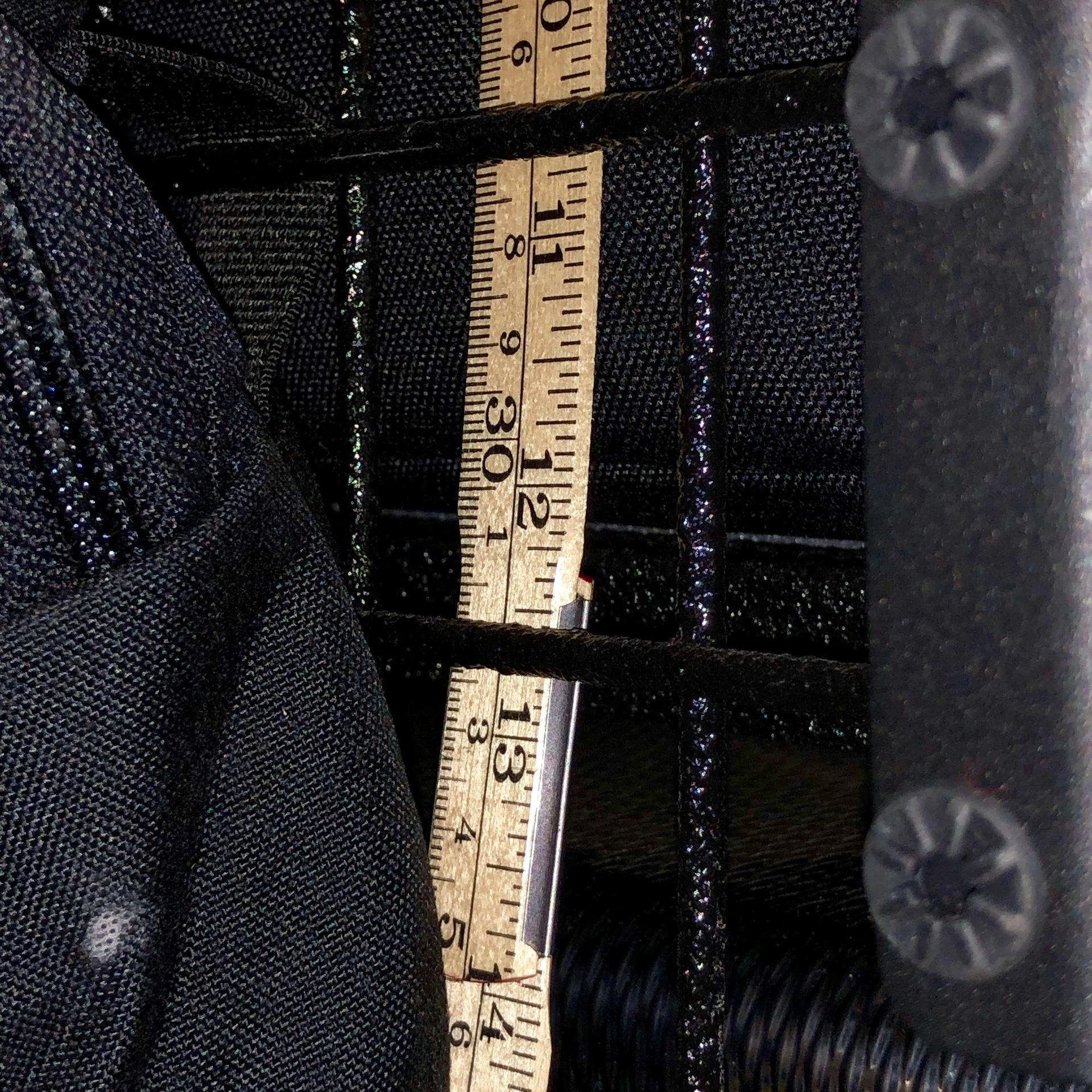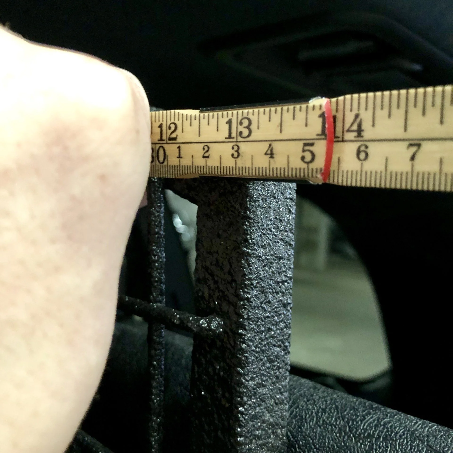 The ruler is slanted a bit in the photos so I'd reduce the measurement a bit. The rear-most section of the shelf has about 8.75 inches between the headliner and the shelf. That's with the 60L NL fridge... the 60L ARB fridge has much more room since it's a bit wider (and maybe longer). The forward part of the shelf has a little over 12 inches of clearance between the shelf and the headliner. The headliner slope is gradual as it's about 13 inches from the rear of the shelf to the point where you get full access to the 12 inches of height. You'll also notice that the contour on the side of the reduces the height to about 7 inches.