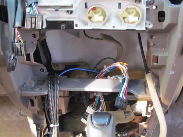 Anyway, once I got the trim off, I got the old radio out and then had to swap my antenna. I am not sure, but I believe that my antenna had been swapped once before because the routing was not along the AC duct as noted in the write-up, but wedged in above the dash steel tubing. There were no zip-ties to access and the cable could not be pulled at all, so since I had a new one to go in, I cut the end off so that I could pull the wire out. I then just pulled in the new antenna cable and routed it myself, zip-tying it up out of the way, but in a more accessible location. This process was not documented because I was too busy trying to figure out WTF was going on, but I did snap a couple pictures of the finished product.