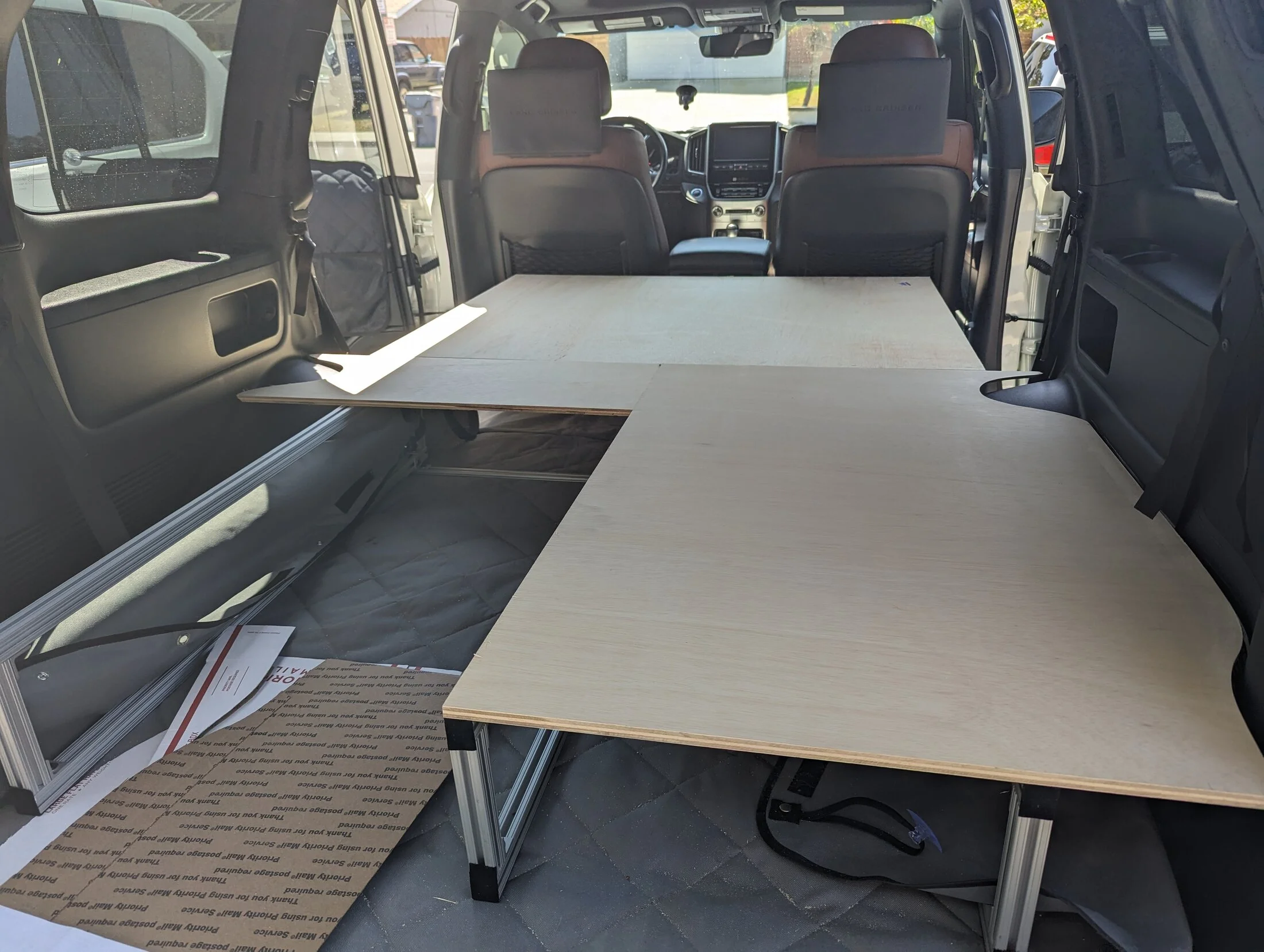 8020.net has everything but is expensive. Tnutz.com has better pricing and I didn't have any issues with shipping and such. The only piece tnutz didn't have was the flat used to anchor system to truck using existing screw holes (pic). I used the 10 series which is a 1"x1" square. Wood is .5" birch with overall height of 12" which means it just about lays flat with seat back when that seat is folded down. I removed 60 section for additional storage and sleeping platform.
