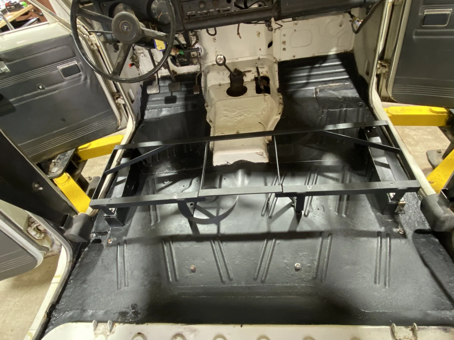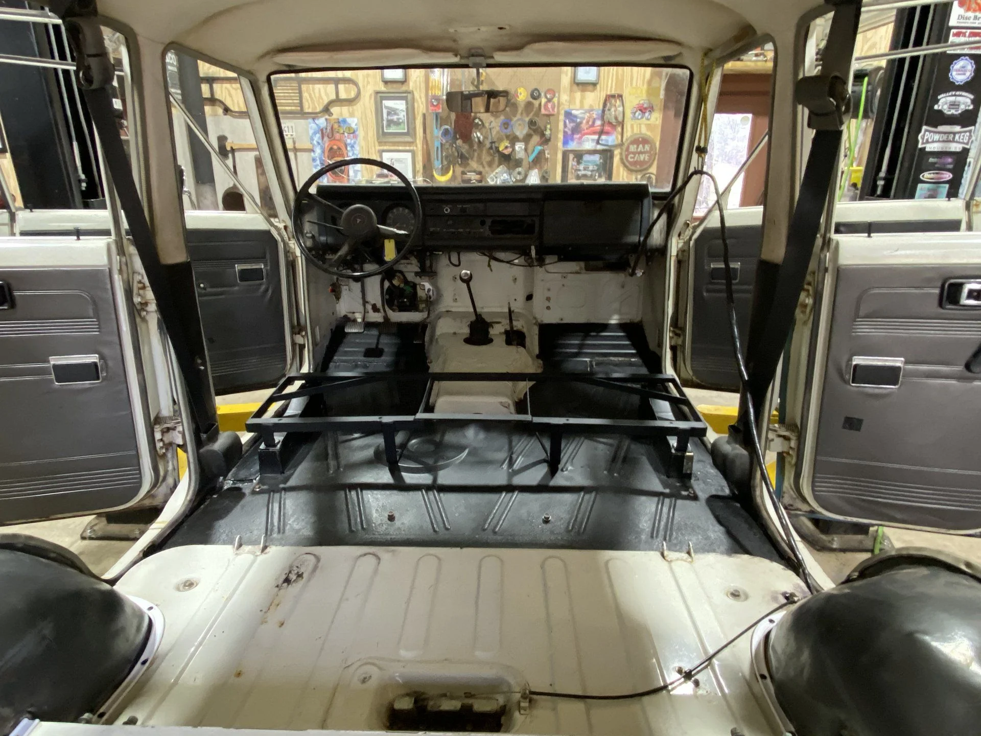 What a beautiful sight. Clean and ready for the rebuild as parts come in. The foot wells forward are getting Lizard Skin and the pretty white stays white and uncoated.