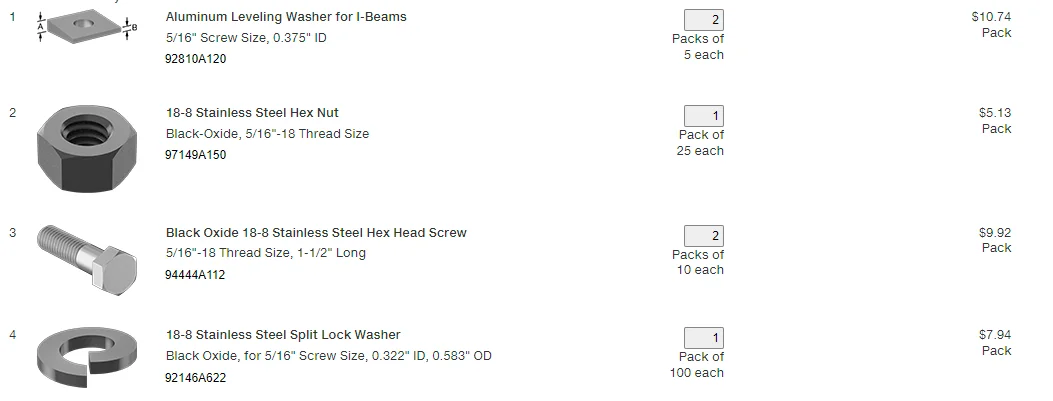 Parts I ordered for this, all from McMaster Carr (P/N to search is the 9xxxxxxx):