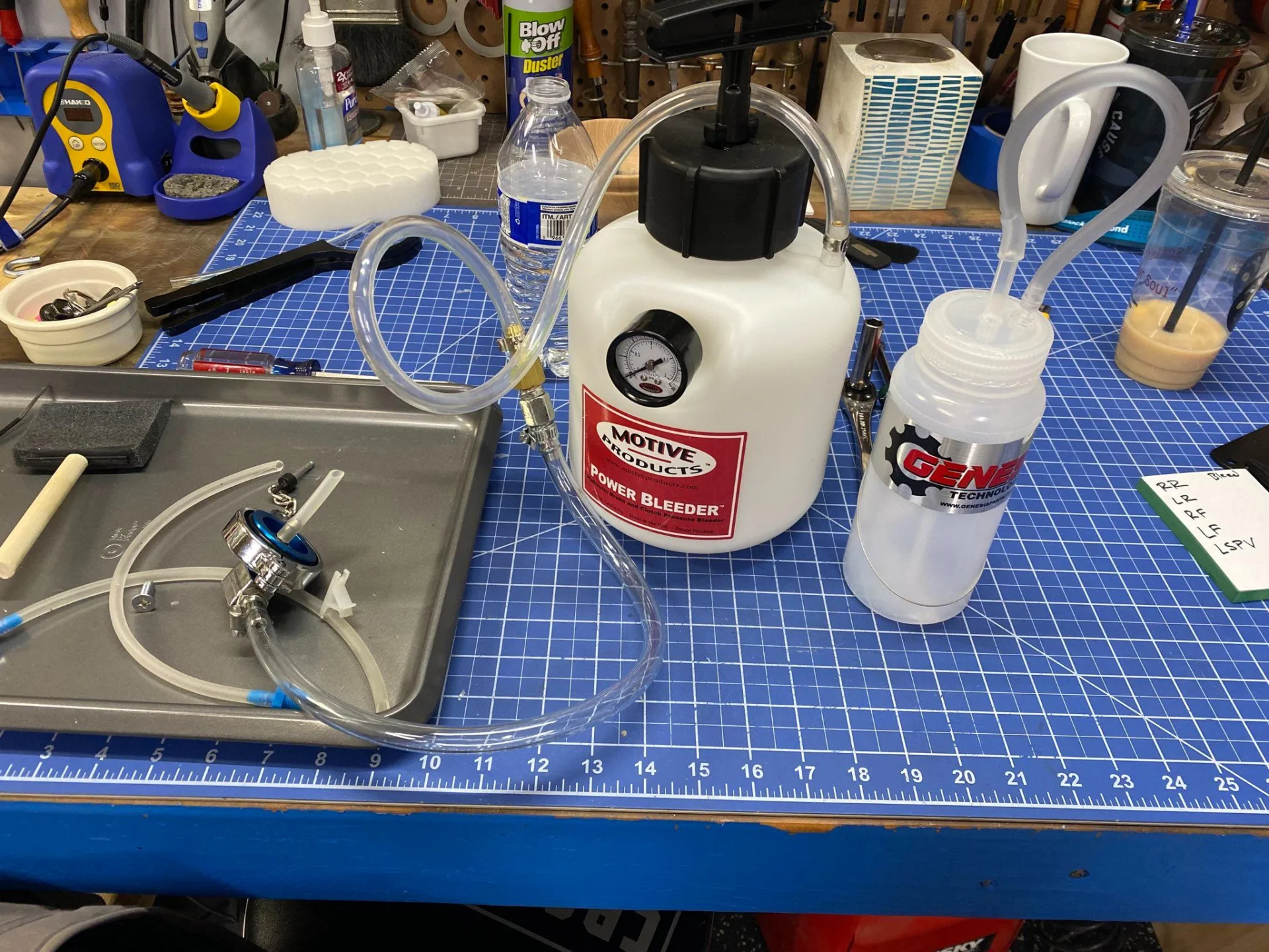 I used the Motive power bleeder (P/N 0101 universal) and paired it with the ARES 18003 - 43mm master cylinder adapter. Thing worked great for bleeding solo. The fluid that came out was really bad.... replaced with Dot 3 for now.