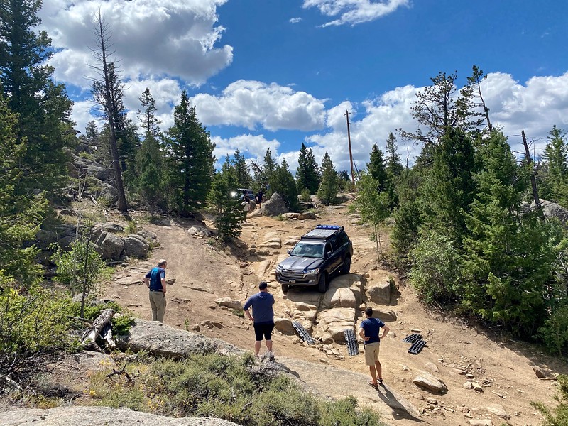 Yeah, the right line is better. This was a bit of a puzzling obstacle. We did it with two spotters and the clearance in a few spots was just weird enough that we had to pay a lot of attention to both the passenger-front and driver-rear to avoid unnecessary damage. It took awhile but we got all the trucks down with little to no scars.