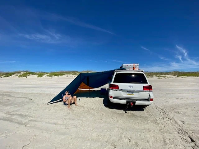 I have the Alu-cab, but for a day on the beach I usually go with a Kelty Noah's tarp affixed to the roof rack and staked down with ground grabba sand anchors. This makes for a nice shady area on the leeward side of the truck out of the blowing sand making an otherwise miserable beach day workable.