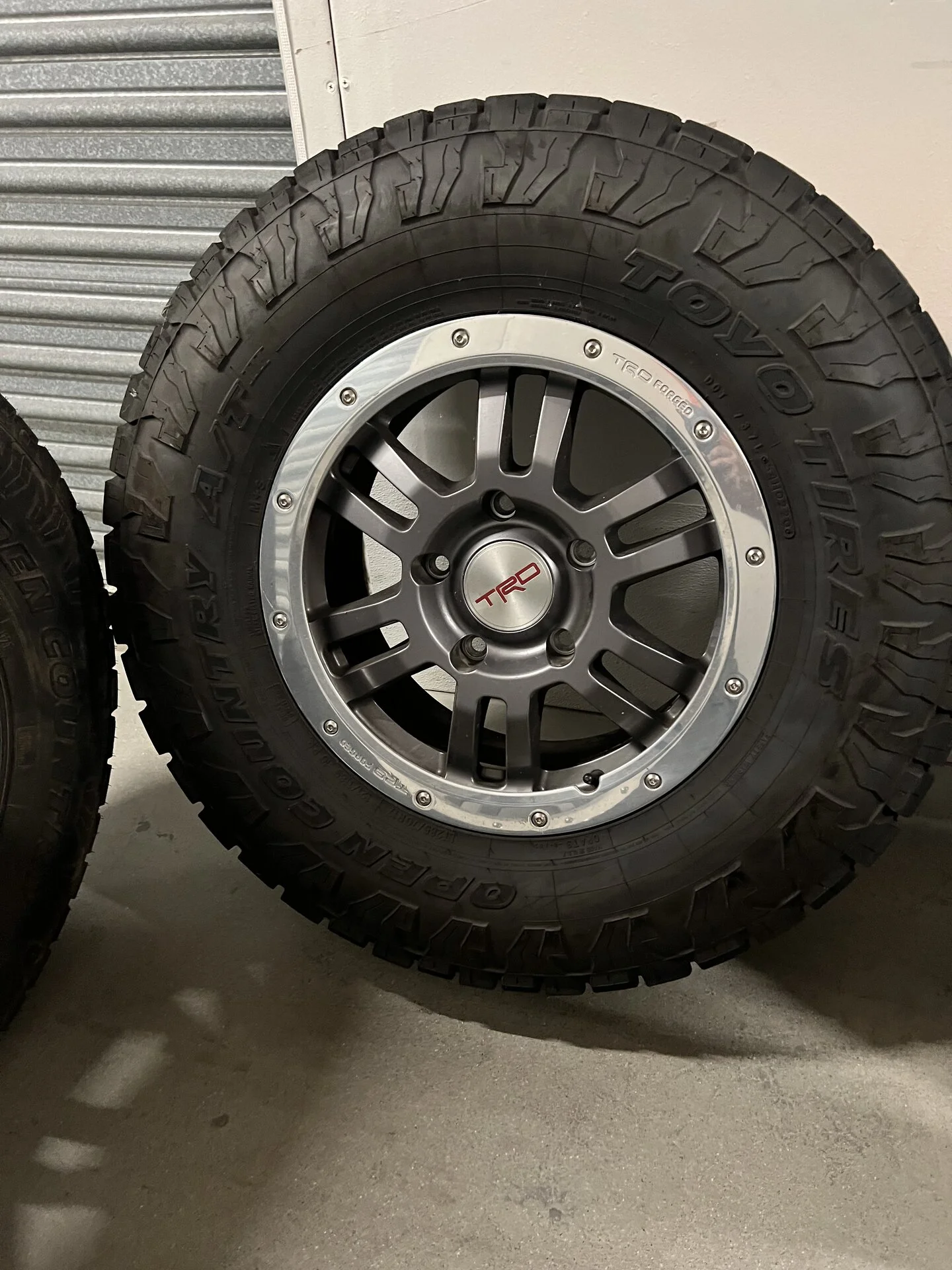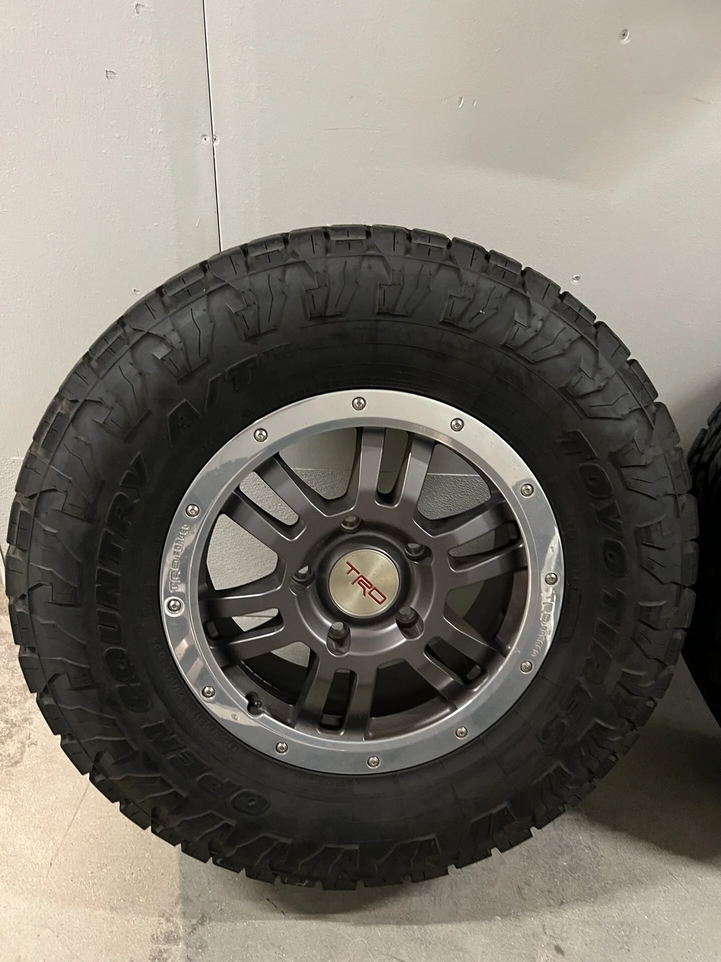 Sorry, left out some important details.Set of 5 Rock Warrior wheels with Toyo Open Country AT3s. Spare has never been driven on. The other four have less than 2000 miles on them. Includes lug nuts and center caps for 4. Local pick up only.