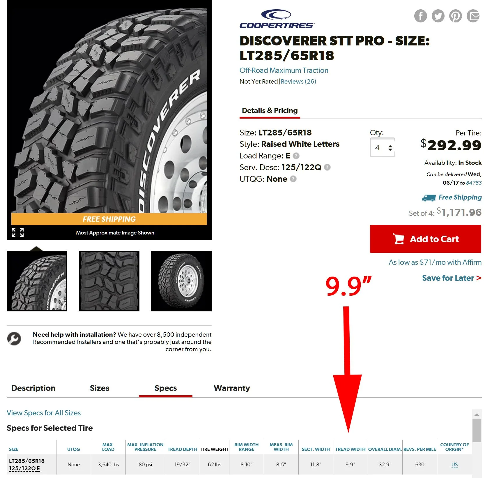 Here is a sample of LT285/65R18 tires and their specified tread widths: