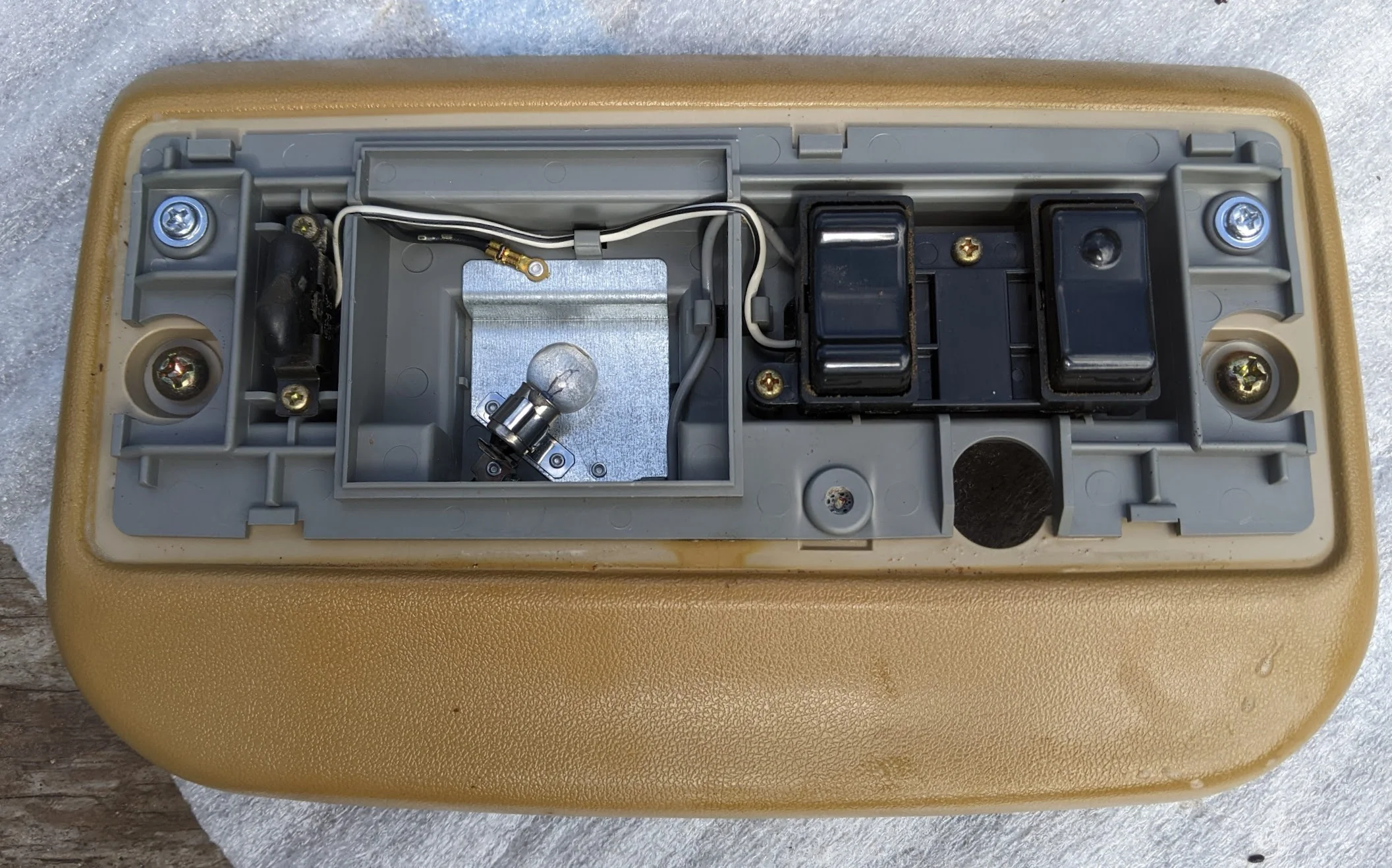 While there, this overhead console looked bad...bromine + sunlight + time caused this to yellow. I can't think of anything else that has done this, except for the sunroof plastic trim.