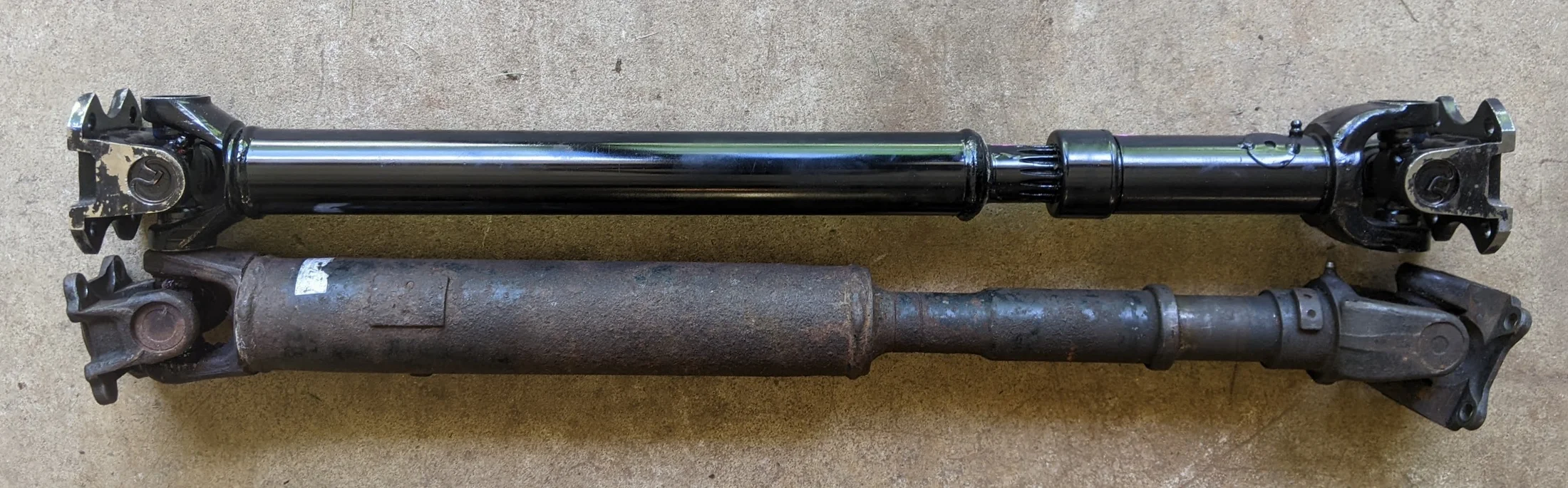 New front and rear driveshafts arrived. Here is the old front vs the new front drive shaft. Besides being 1.5" longer than stock, it is also thinner, which should help with any potential LS swap cleanance issues.
