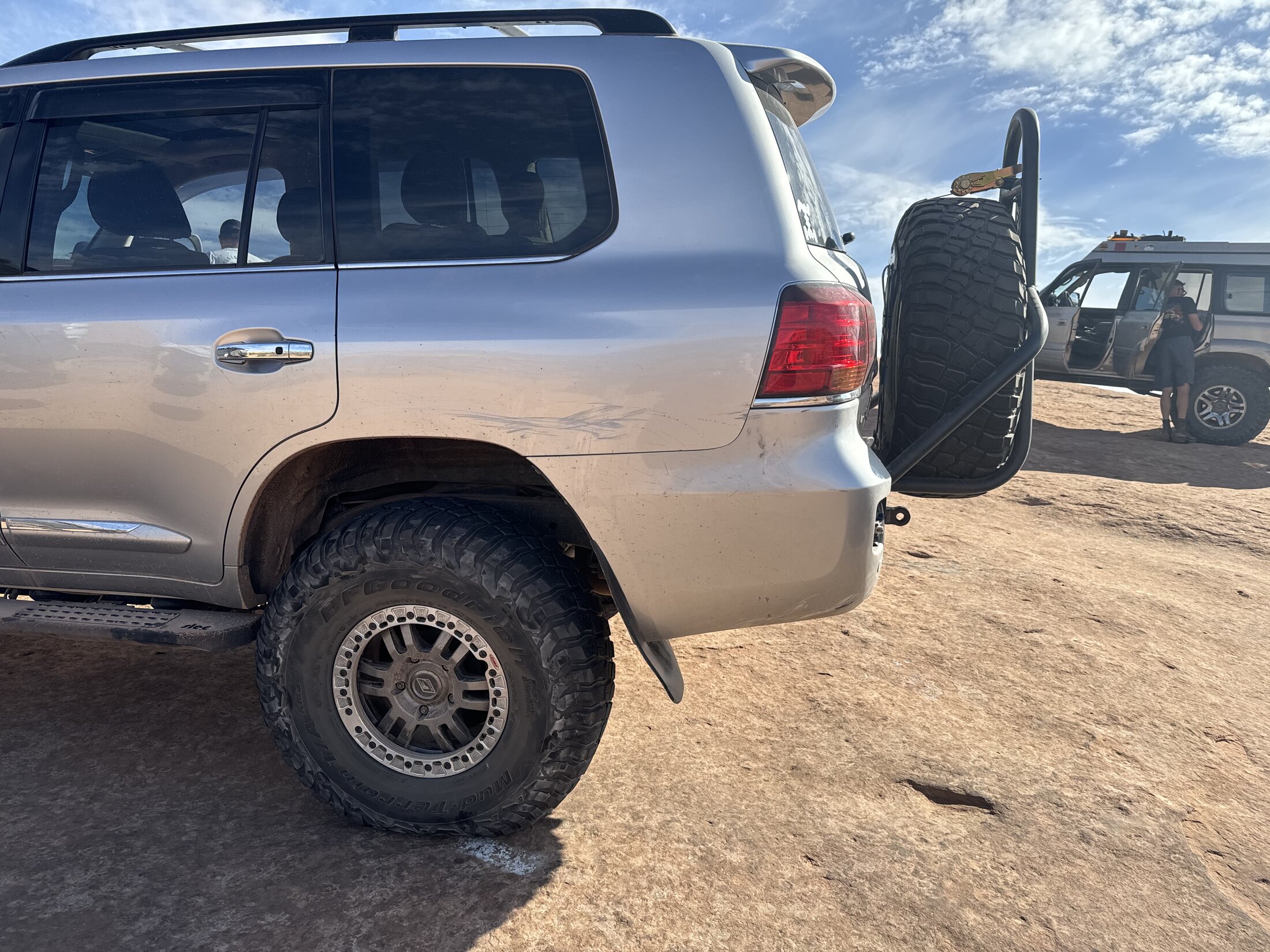 Got a little hung up on a rock in Moab and tried to power through (AKA slide). Well I slid, but the front edge of the slider bent up into the quarter panel. Not the full weight of the vehicle, but a pretty solid impact--enough to make the wife ask if I broke anything :hillbilly: Somewhere a little over 1/2" deflection. The body of the slider was not deformed and actually took the abuse quite well (and I have impacted the sliders more lightly many times, the body held up fine other than scraping off the powdercoat). I think the attachment arms are just a little weak for heavy use.
