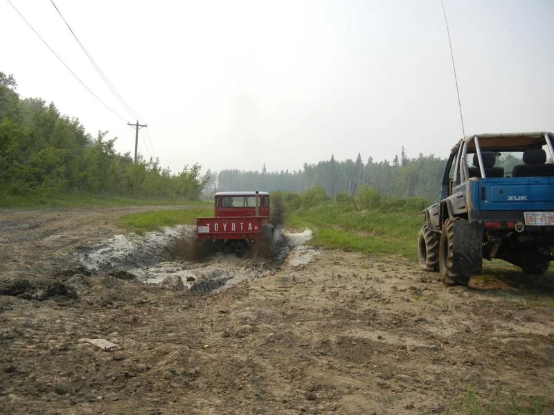 It was 25 deg (celcius) today and the truck sat at 210-215 all day. Lots of gear noise from the axles at higher speeds, especially when decellerating. Lot's of flying mud due to exposed tires. Only the outside of the tailgate was still clean when we were done.