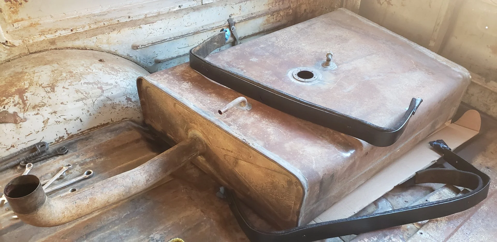 The fuel tank is back from the radiator shop, it's now sealed and pressure tested. They put some sort of red varnish looking stuff in it, and got the rocks out.