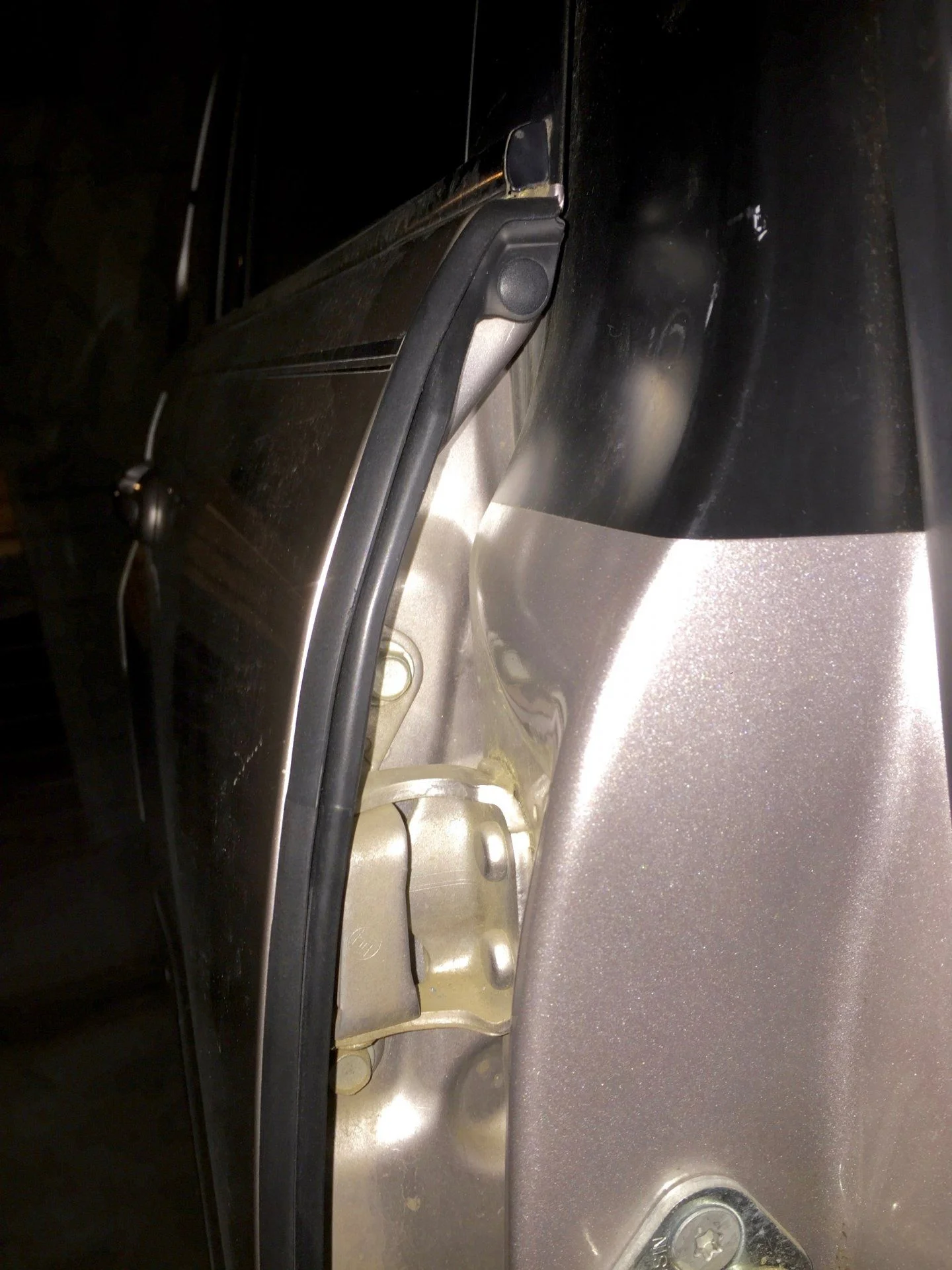I got around to sticking the front edge strips on but ran out of time to drill the holes so I'll have to do that another time. The adhesive strip seems to work very well in the meantime and it comes with a handy pull tab to easily remove the adhesive backing as you go. First impressions of these strips are very good, the strip is perfectly formed to the curvature of the door edge and even forms around the side molding indentation nicely. Instead of a clip at the bottom there is a ~2" piece of plastic that wraps around the other side of the door that tightly sandwiches the door edge between it and the strip itself. I was only able to get a crappy pic because it was dark by the time I put them on, but after driving around on residential & city streets for 15min they seem to definitely reduce noise inside the cabin.