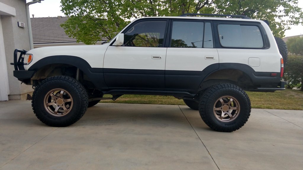 Used about a year. Decent Condition. Pretty light wheel. Just some rash on a few of them. Clean and ready to be mounted. I ran them with 1.5" spacers on my 80 Series, and they fit over the hubs with the center caps on.