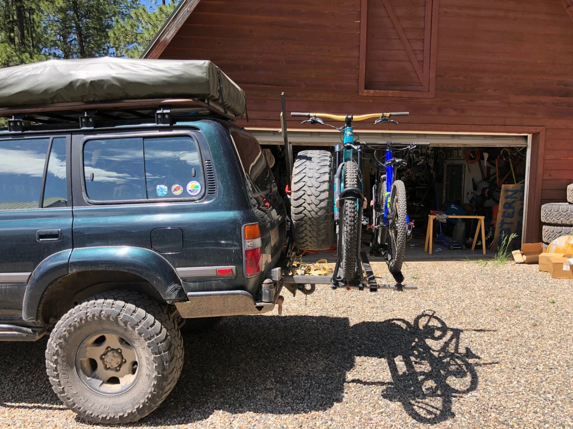 Here's a picture of the rack. It's pretty much just a 2" square "T". The baskets bolt in on the top. The rear wheel slots into that little aluminum "U" near the bottom, and right now I just wrap a little strap around the tire/rack (need to put a permanently mounted rubber strap on here). I used the same basket to rear wheel slot geometry as the Recon rack. (Note, only one of the rear wheel slots is currently installed - the second one will be mirrored on the right side of the vertical tube once I get around to it). The flange at the base with 4 bolts is so I can bolt different attachments onto the swing out. Please excuse the lack of paint.