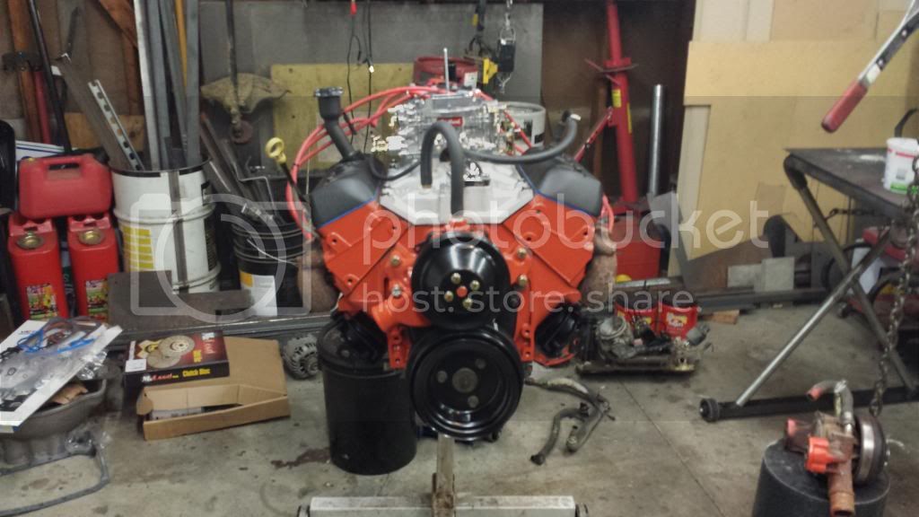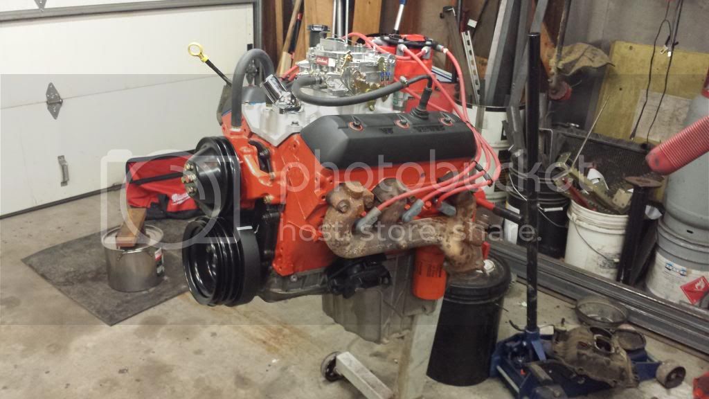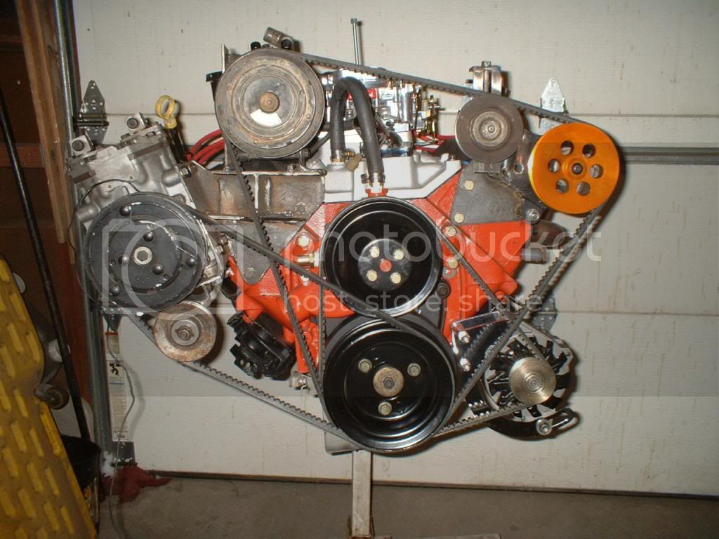 I installed the bracket for the AC and air compressor because the ac compressor is the highest thing on the front of the motor. Then I set the hood on the fenders and raised the engine until I had about 1 inch between the hood and the top of the compressor. The following pics will show the rest of the clearance issues.