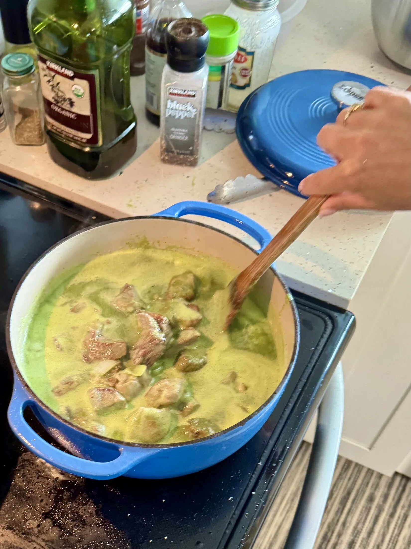 With an overflowing grocery bag of chile peppers, tomatillos, onion, garlic, cilantro and a fresh slab of pork shoulder…the events were set in motion with the help of an old family recipe for deliciously tender slow cooked Chile Verde. Not to spicy, but bursting with flavor. Here it is about an hour on the stove.