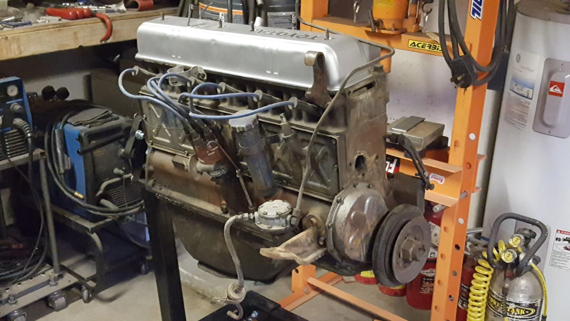 Spent most the day rearranging heavy stuff in the side yard. Got the "new" donor motor on the stand and ready to work on. Need to get the rest of the drive train sorted, cleaned, painted and resealed. Let the motor fun begin.