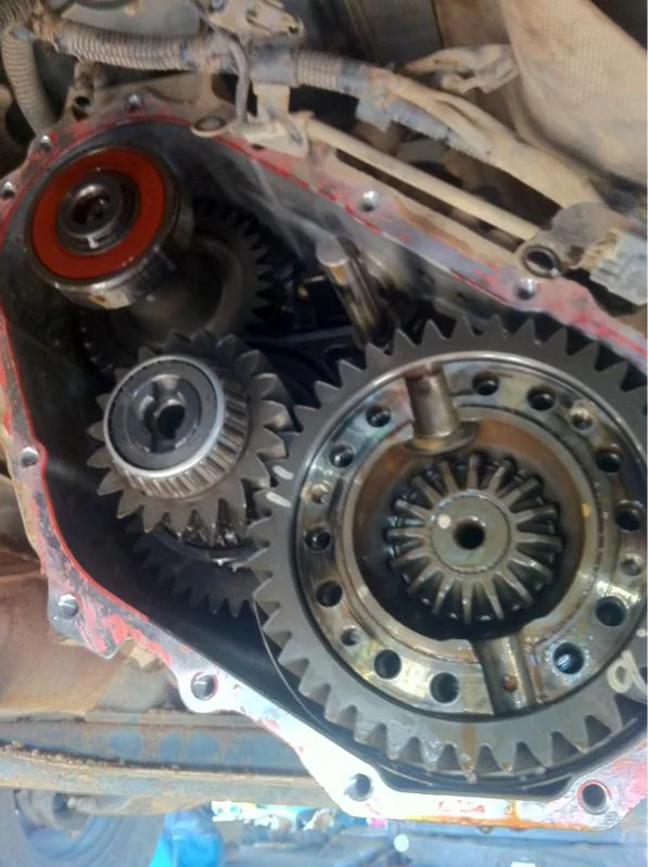 Once you've removed the circlip, you can take the rest of the bolts out that are bolting to back half of the transfer to the front. When you go to remove this housing, push the transfer input shaft forwards at the same time, otherwise it may come out of the shaft seal on the gearbox side. If that happens, you'll have to replace that seal. Once the halves are split, you'll be looking at this.