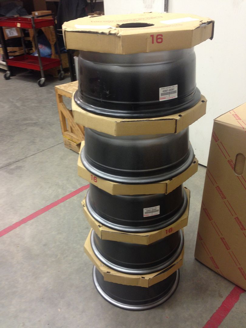 Drum Roll...shop just called. Wheels powder coated, check. 5 BFG T/A KO2 285/75/16's to store, check. Mount and road force balance, check. Call customer, wheels & tires are ready for pickup, check.