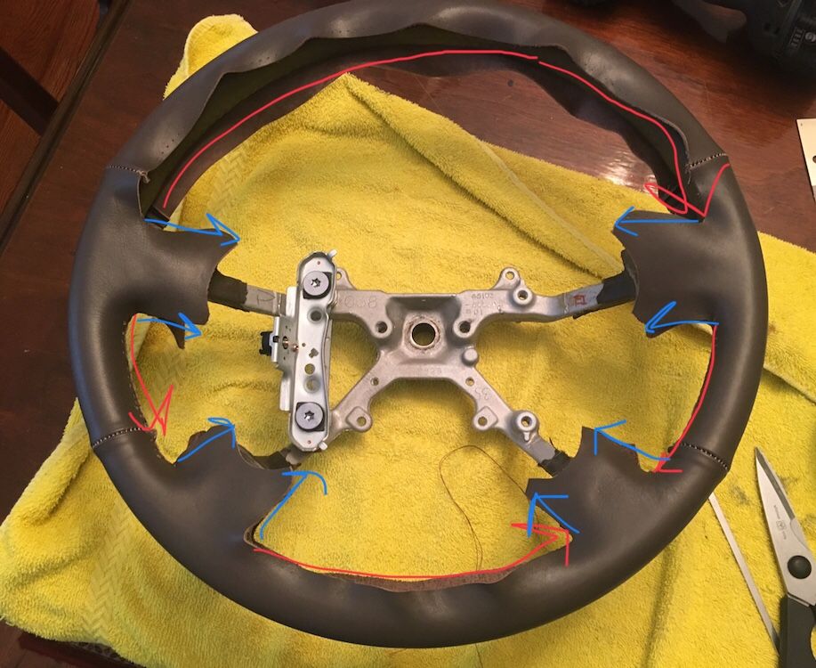 My steering wheel was extremely worn, and a hole about 6 to 8 inches was cracking across the top of the wheel. Because of my OCD, I knew I had to fix it. My research brought me to a steering wheel cover, which is offered by a company that is associated with this website, but the prices seemed high, the color did not seem to correctly match the factory color, and the vendor has several questionable ratings on the “Buyer Beware” section of the MUD classifieds. Due to all these factors, I set out to do everything on my own.