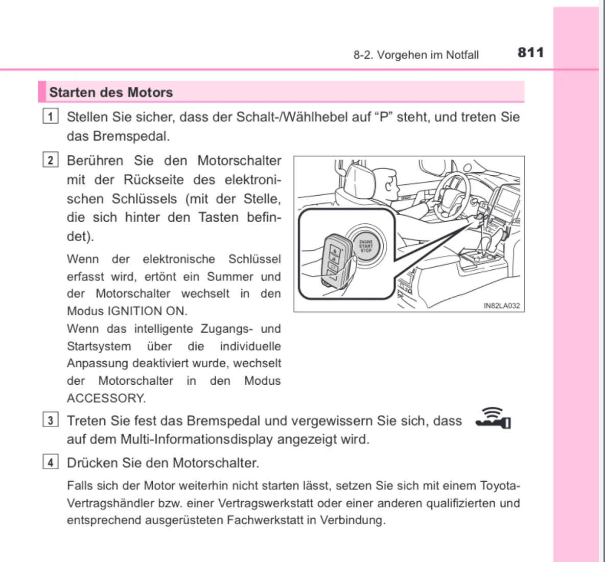 Everything seems normal. I unlock the car, with the FOB. Push the brake, the ON button turns green, but nothing happens when I push it.