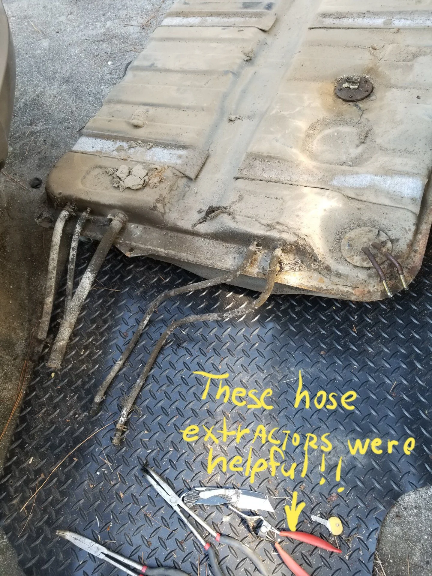 Well, I (the one man show) took the day off and took advantage of this nice weather in VaH- Beach to lower the Gas Tank. @IamGhost FJ60 Fuel Tank Removal Procedure helped out a lot. However, there are things that can help as well, such as; a Hose Extractor (a great investment), a good penetrent ( I like Knocker Loose & Liquid Wrench)...I soaked all bolts one week prior to today. It seems mine never came down since the last time they replaced for recall since 1995. The tire cross member was a PITA to get down, due to those old bolts and washer/nut on other side....it's not going back up, because A) I run 31x10.5 and I choose not to have a spare underneath B) It will shed about 25 lbs. Everything else went pretty well and I didn't see any rust but a lot of green Ethanol Residue. Its amazing what you discover when DIY things regarding the cargo mat was from Specter Off-Road.