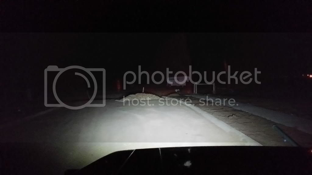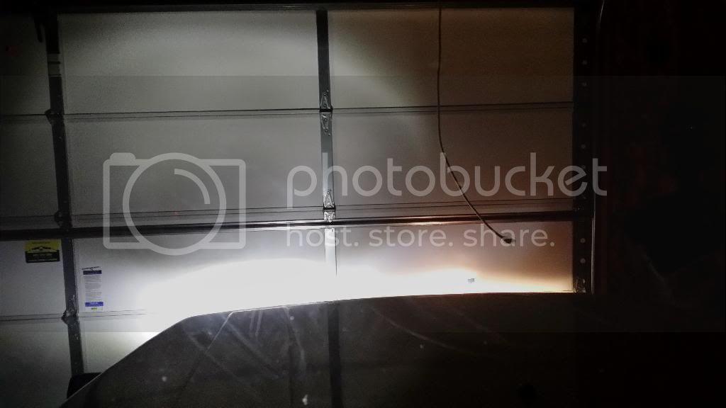 difference between standard halogen (right) and HID (left). HID is MUCH whiter. There is tape where the beams were pointed. The HID completely washed out the tape in the picture.