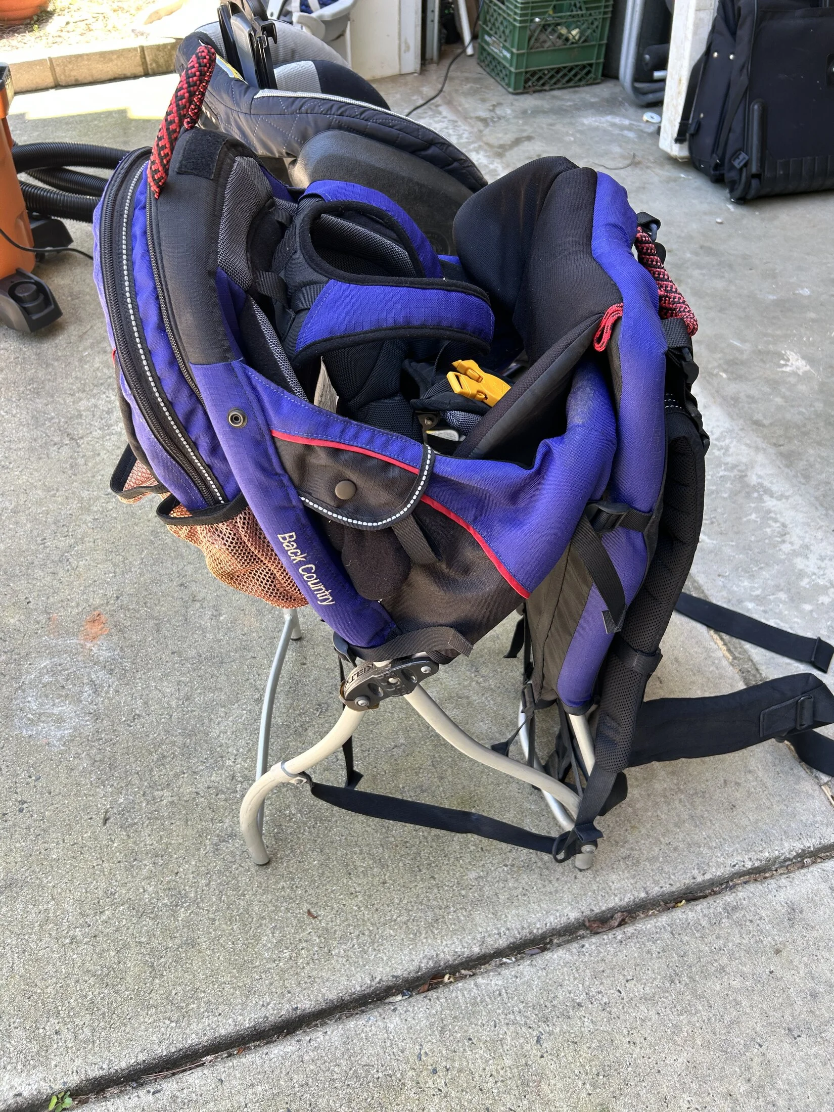 FREE- Kelty kids, back country baby backpack for taking a baby on a hike, also a Britax car seat, and a seat for a bicycle that removes from the rack mount.