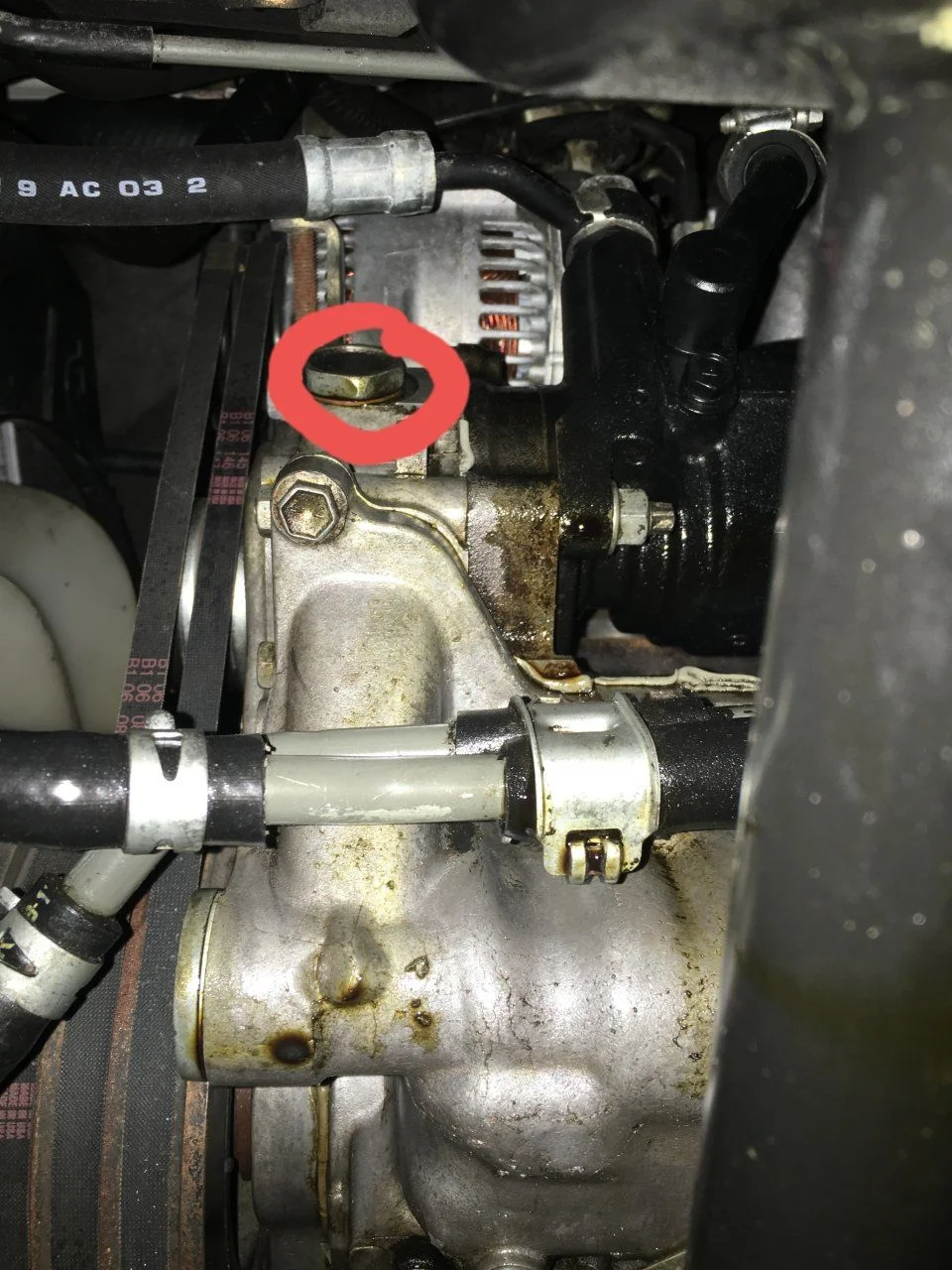 closest to the alternator belts facing up in the photo: