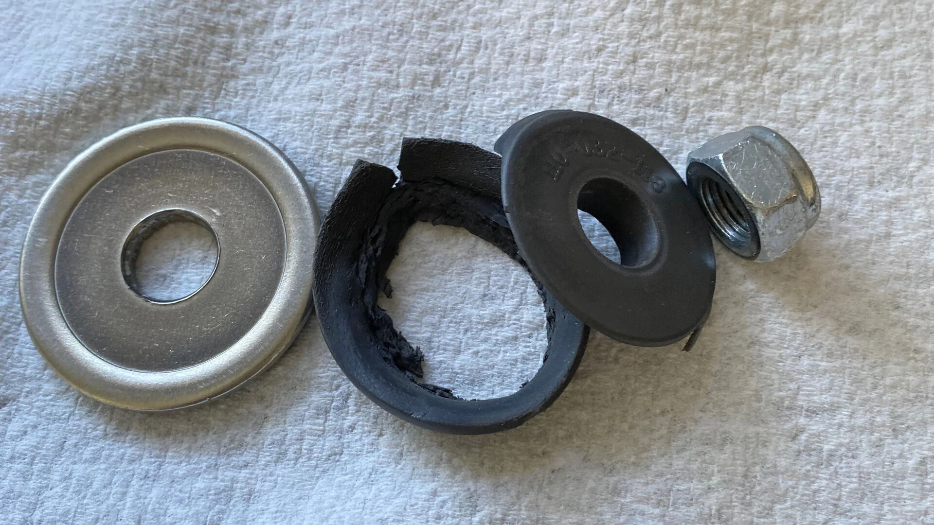 This is what the top bushing on the driver side looks like... It's completely blown out and the strut moves around in the mount. Doesn't look like there's any damage to the mount. The passenger side is fine. I wonder what went wrong here?